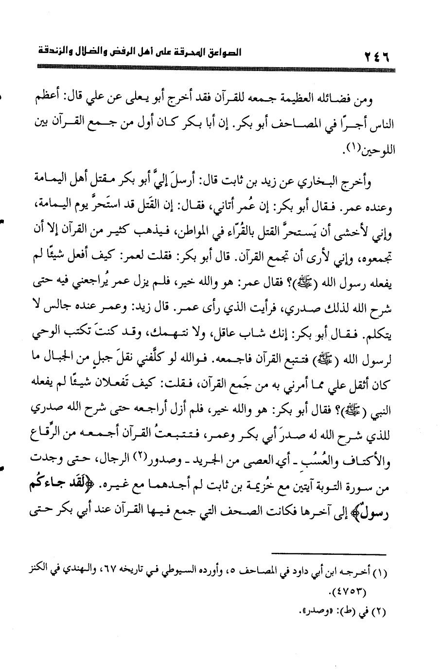 واخرج البُخَارِيّ عَن زيد بن ثَابت قَالَ أرسل إِلَيّ أَبُو بكر مقتل أهل الْيَمَامَة وَعِنْده عمر فَقَالَ أَبُو بكر إِن عمر أَتَانِي فَقَالَ إِن الْقَتْل قد استحر يَوْم الْيَمَامَة وَإِنِّي لأخشى أَن يستحر الْقَتْل بالقراء فِي المواطن فَيذْهب كثير من الْقُرْآن إِلَّا أَن تجمعوه وَإِنِّي لأرى أَن تجمع الْقُرْآن قَالَ أَبُو بكر فَقلت لعمر كَيفَ أفعل شَيْئا لم يَفْعَله رَسُول الله صلى الله عَلَيْهِ وَسلم فَقَالَ عمر هُوَ وَالله خير فَلم يزل عمر يراجعني فِيهِ حَتَّى شرح الله لذَلِك صَدْرِي فَرَأَيْت الَّذِي رأى عمر قَالَ زيد وَعمر عِنْده جَالس لَا يتَكَلَّم فَقَالَ أَبُو بكر إِنَّك شَاب عَاقل وَلَا نتهمك وَقد كنت تكْتب الْوَحْي لرَسُول الله صلى الله عَلَيْهِ وَسلم فتتبع الْقُرْآن فاجمعه فوَاللَّه لَو كلفني نقل جبل من الْجبَال مَا كَانَ أثقل عَليّ مِمَّا أَمرنِي بِهِ من جمع الْقُرْآن فَقلت كَيفَ تفعلان شَيْئا لم يَفْعَله النَّبِي صلى الله عَلَيْهِ وَسلم فَقَالَ أَبُو بكر وَهُوَ وَالله خير فَلم أزل أراجعه حَتَّى شرح الله صَدْرِي للَّذي شرح الله لَهُ صدر أبي بكر وَعمر فتتبعت الْقُرْآن أجمعه من الرّقاع والأكتاف والعسب أَي العصى من الجريد وصدور الرِّجَال حَتَّى وجدت من سُورَة التَّوْبَة آيَتَيْنِ مَعَ خُزَيْمَة بن ثَابت لم أجدهما مَعَ غَيره {لقد جَاءَكُم رَسُول} إِلَى آخرهَا فَكَانَت الصُّحُف الَّتِي جمع فِيهَا الْقُرْآن عِنْد أبي بكر حَتَّى
