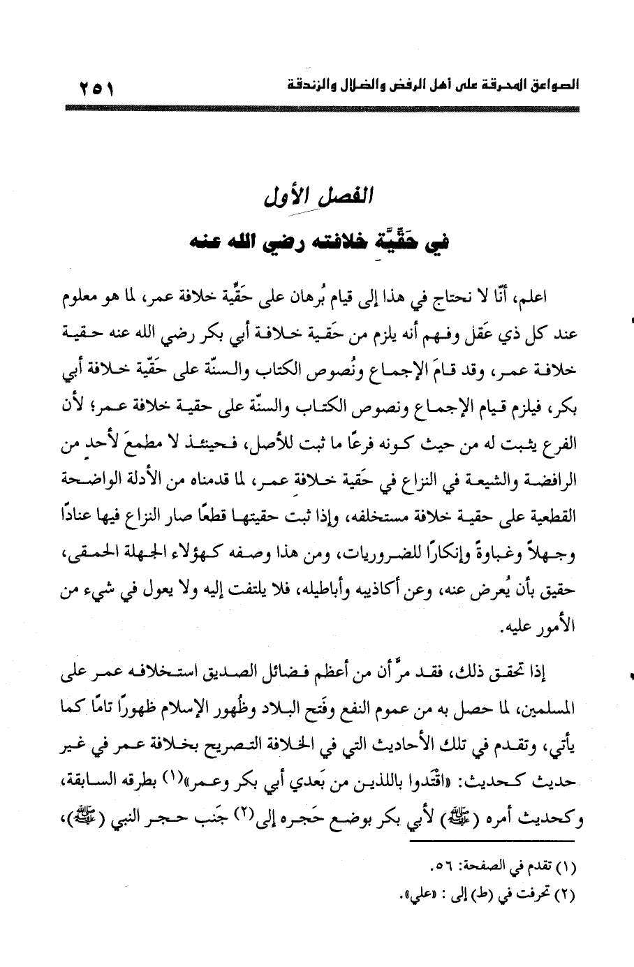 اعْلَم أَنا لَا نحتاج فِي هَذَا إِلَى قيام برهَان على حقية خلَافَة عمر لما هُوَ مَعْلُوم عِنْد كل ذِي عقل وَفهم أَنه يلْزم من حقية خلَافَة أبي بكر رَضِي الله عَنهُ حقية خلَافَة عمر وَقد قَامَ الْإِجْمَاع ونصوص الْكتاب وَالسّنة على حقية خلَافَة أبي بكر فَيلْزم قيام الْإِجْمَاع ونصوص الْكتاب وَالسّنة على حقية خلَافَة عمر لِأَن الْفَرْع يثبت لَهُ من حَيْثُ كَونه فرعا مَا ثَبت للْأَصْل فَحِينَئِذٍ لَا مطمع لأحد من الرافضة والشيعة فِي النزاع فِي حقية خلَافَة عمر لما قدمْنَاهُ من الْأَدِلَّة الْوَاضِحَة القطعية على حقية خلَافَة مستخلفه وَإِذا ثَبت حقيتها قطعا صَار النزاع فِيهَا عنادا وجهلا وغباوة وَإِنْكَارا للضروريات وَمن هَذَا وَصفه كهؤلاء الجهلة الحمقى حقيق بِأَن يعرض عَنهُ وَعَن أكاذيبه وأباطيله فَلَا يلْتَفت إِلَيْهِ وَلَا يعول فِي شَيْء من الْأُمُور عَلَيْهِ