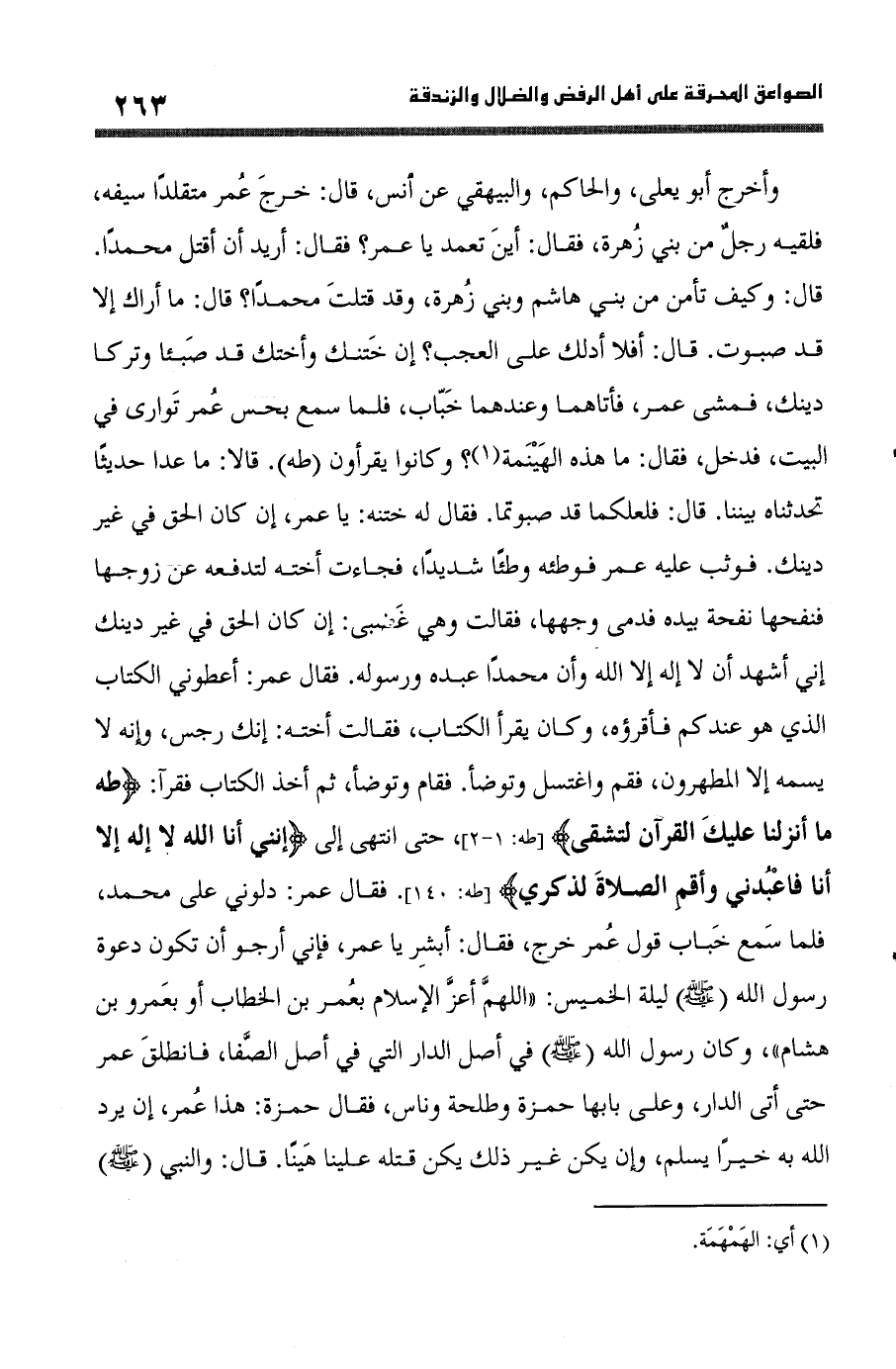 وَأخرج أَبُو يعلى وَالْحَاكِم وَالْبَيْهَقِيّ عَن أنس قَالَ خرج عمر مُتَقَلِّدًا سَيْفه فَلَقِيَهُ رجل من بني زهرَة فَقَالَ أَيْن تعمد يَا عمر فَقَالَ أُرِيد أَن اقْتُل مُحَمَّدًا قَالَ وَكَيف تأمن من بني هَاشم وَبني زهرَة وَقد قتلت مُحَمَّدًا قَالَ مَا أَرَاك إِلَّا قد صبوت قَالَ أَفلا أدلك على الْعجب إِن ختنك وأختك قد صبئا وتركا دينك فَمشى عمر فأتاهما وَعِنْدَهُمَا خباب فَلَمَّا سمع بحس عمر توارى فِي الْبَيْت فَدخل فَقَالَ مَا هَذِه الهينمة وَكَانُوا يقرأون طه قَالَا مَا عدا حَدِيثا تحدثناه بَيْننَا قَالَ فلعلكما قد صبوتما فَقَالَ لَهُ ختنه يَا عمر إِن كَانَ الْحق فِي غير دينك فَوَثَبَ عَلَيْهِ عمر فوطئه وطئا شَدِيدا فَجَاءَت أُخْته لتدفعه عَن زَوجهَا فنفحها نفحة بِيَدِهِ فدمى وَجههَا فَقَالَت وَهِي غَضَبي إِن كَانَ الْحق فِي غير دينك إِنِّي اشْهَدْ أَن لَا إِلَه إِلَّا الله وَأَن مُحَمَّدًا عَبده وَرَسُوله فَقَالَ عمر أعطوني الْكتاب الَّذِي هُوَ عنْدكُمْ فأقرؤه وَكَانَ يقْرَأ الْكتاب فَقَالَت أُخْته إِنَّك رِجْس وَإنَّهُ لَا يسمه إِلَّا الْمُطهرُونَ فَقُمْ واغتسل وَتَوَضَّأ فَقَامَ وَتَوَضَّأ ثمَّ أَخذ الْكتاب فَقَرَأَ {طه مَا أنزلنَا عَلَيْك الْقُرْآن لتشقى} حَتَّى انْتهى إِلَى {إِنَّنِي أَنا الله لَا إِلَه إِلَّا أَنا فاعبدني وأقم الصَّلَاة لذكري} فَقَالَ عمر دلوني على مُحَمَّد فَلَمَّا سمع خباب قَول عمر خرج فَقَالَ أبشر يَا عمر فَإِنِّي أَرْجُو أَن تكون دَعْوَة رَسُول الله صلى الله عَلَيْهِ وَسلم لَيْلَة الْخَمِيس (اللَّهُمَّ أعز الْإِسْلَام بعمر بن الْخطاب أَو بِعَمْرو بن هِشَام) وَكَانَ رَسُول الله صلى الله عَلَيْهِ وَسلم فِي أصل الدَّار الَّتِي فِي أصل الصَّفَا فَانْطَلق عمر حَتَّى أَتَى الدَّار وعَلى بَابهَا حَمْزَة وَطَلْحَة وناس فَقَالَ حَمْزَة هَذَا عمر إِن يرد الله بِهِ خيرا يسلم وَإِن يكن غير ذَلِك يكن قَتله علينا هينا قَالَ وَالنَّبِيّ صلى الله عَلَيْهِ وَسلم