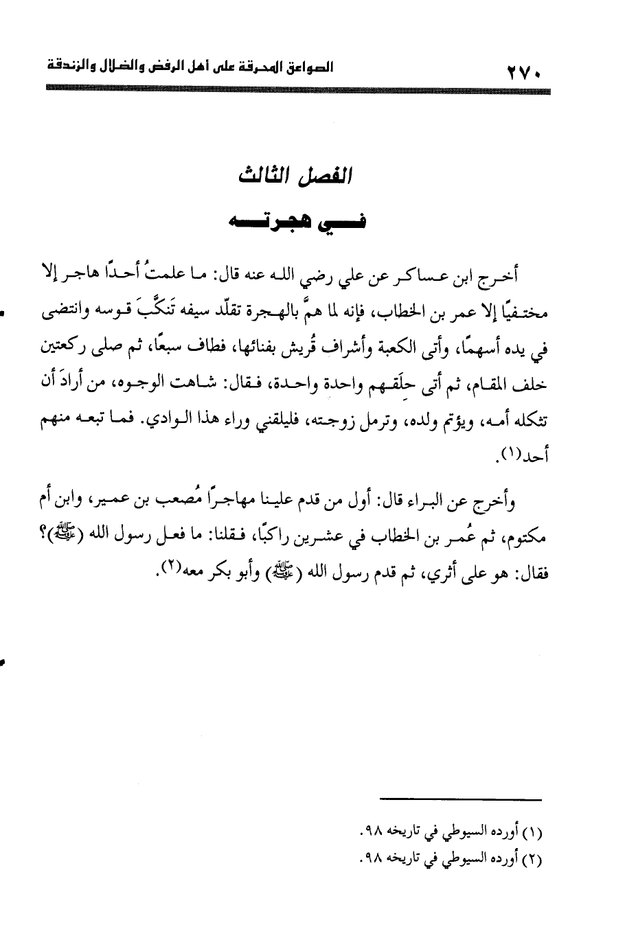 أخرج ابْن عَسَاكِر عَن عَليّ رَضِي الله عَنهُ قَالَ مَا علمت أحدا هَاجر إِلَّا مختفيا إِلَّا عمر بن الْخطاب فَإِنَّهُ لما هم بِالْهِجْرَةِ تقلد سَيْفه تنكب قوسه وانتضى فِي يَده أسهما وأتى الْكَعْبَة وأشراف قُرَيْش بفنائها فَطَافَ سبعا ثمَّ صلى رَكْعَتَيْنِ خلف الْمقَام ثمَّ أَتَى حلقهم وَاحِدَة وَاحِدَة فَقَالَ شَاهَت الْوُجُوه من أَرَادَ أَن تثكله أمه ويؤتم وَلَده وترمل زَوجته فليلقني وَرَاء هَذَا الْوَادي فَمَا تبعه مِنْهُم أحد
