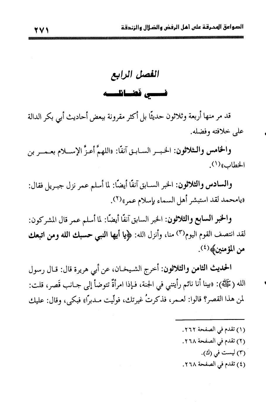 قد مر مِنْهَا أَرْبَعَة وَثَلَاثُونَ حَدِيثا بل أَكثر مقرونة بِبَعْض أَحَادِيث أبي بكر الدَّالَّة على خِلَافَته وفضله