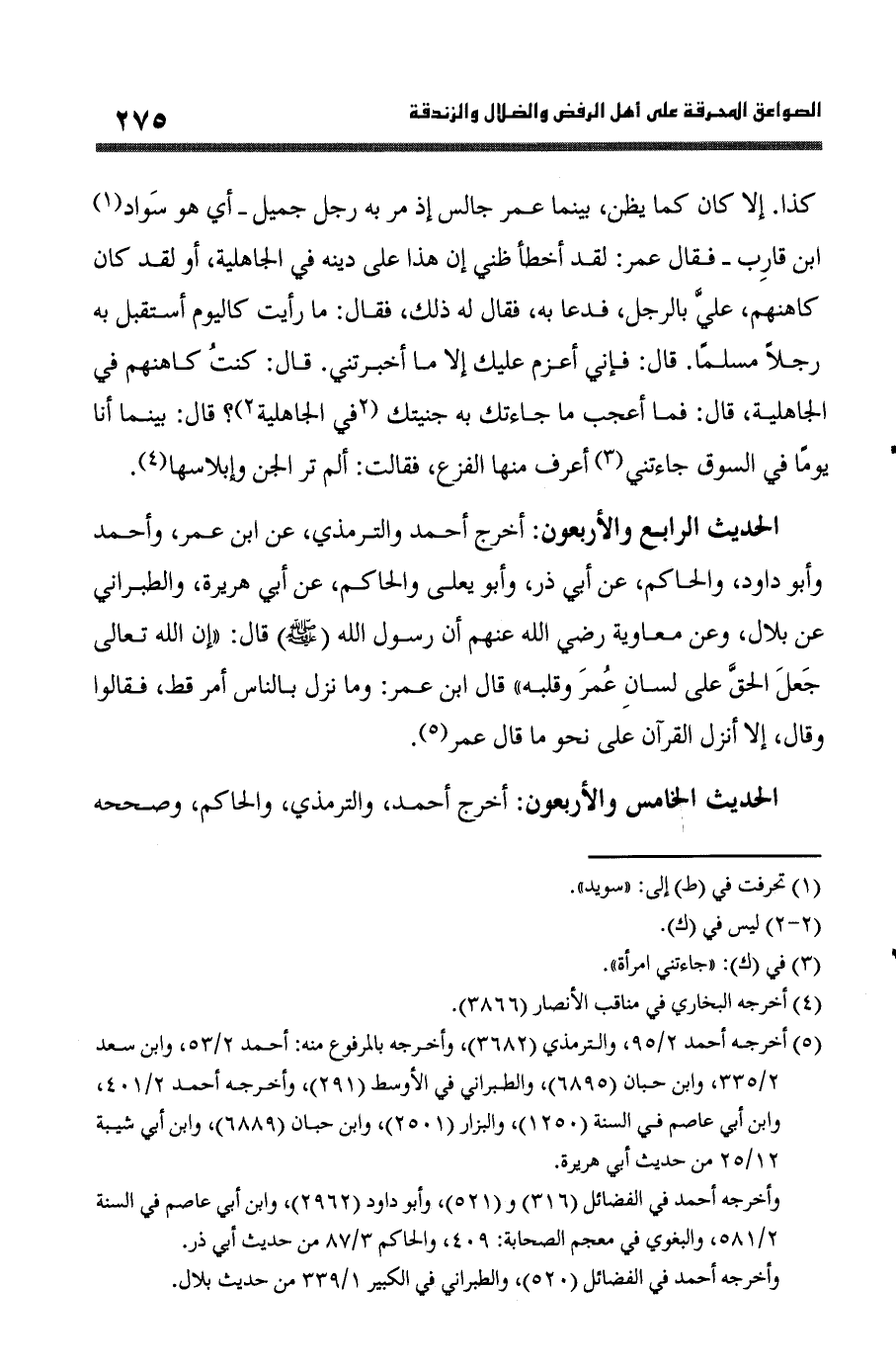 الحَدِيث الرَّابِع وَالْأَرْبَعُونَ أخرج أَحْمد وَالتِّرْمِذِيّ عَن ابْن عمر وَأحمد وَأَبُو دَاوُد وَالْحَاكِم عَن أبي ذَر وابو يعلى وَالْحَاكِم عَن أبي هُرَيْرَة وَالطَّبَرَانِيّ عَن بِلَال وَعَن مُعَاوِيَة رَضِي الله عَنْهُم أَن رَسُول الله صلى الله عَلَيْهِ وَسلم قَالَ (إِن الله تَعَالَى جعل الْحق على لِسَان عمر وَقَلبه) قَالَ ابْن عمر وَمَا نزل بِالنَّاسِ أَمر قطّ فَقَالُوا وَقَالَ إِلَّا أنزل الْقُرْآن على نَحْو مَا قَالَ عمر