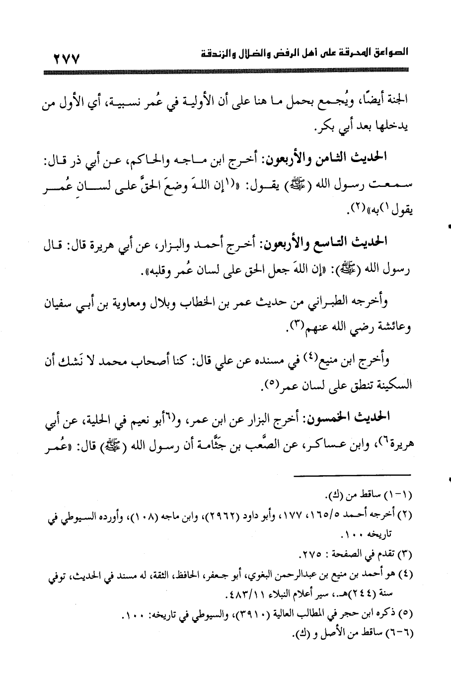 الحَدِيث التَّاسِع وَالْأَرْبَعُونَ أخرج أَحْمد وَالْبَزَّار عَن أبي هُرَيْرَة قَالَ قَالَ رَسُول الله صلى الله عَلَيْهِ وَسلم (إِن الله جعل الْحق على لِسَان عمر وَقَلبه)