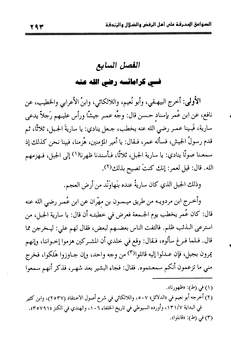 الأولى أخرج الْبَيْهَقِيّ وابو نعيم واللالكائي وَابْن الْأَعرَابِي والخطيب عَن نَافِع عَن ابْن عمر // بِإِسْنَاد حسن // قَالَ وَجه عمر جَيْشًا وَرَأس عَلَيْهِم رجلا يدعى سَارِيَة فَبينا عمر رَضِي الله عَنهُ يخْطب جعل يُنَادي يَا سَارِيَة الْجَبَل ثَلَاثًا ثمَّ قدم رَسُول الْجَيْش فَسَأَلَهُ عمر فَقَالَ يَا أَمِير الْمُؤمنِينَ هَزَمْنَا فَبينا نَحن كَذَلِك إِذْ سمعنَا صَوتا يُنَادي يَا سَارِيَة الْجَبَل ثَلَاثًا فأسندنا ظهرنا إِلَى الْجَبَل فَهَزَمَهُمْ الله قَالَ قيل لعمر إِنَّك كنت تصيح بذلك