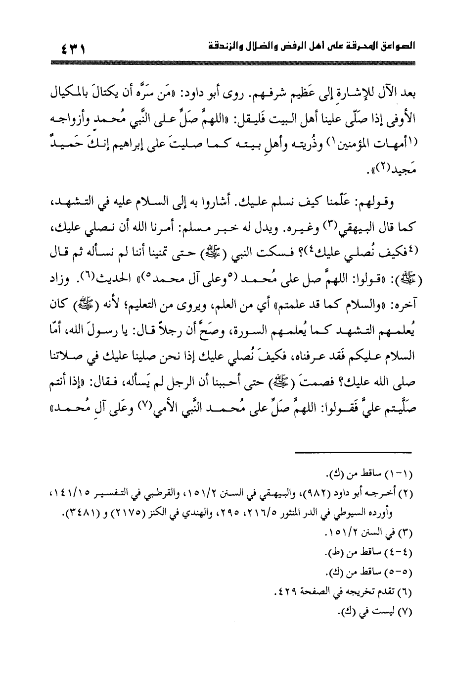 روى أَبُو دَاوُد (من سره أَن يكتال بالمكيال الأوفى إِذا صلى علينا أهل الْبَيْت فَلْيقل اللَّهُمَّ صل على النَّبِي مُحَمَّد وأزواجه أُمَّهَات الْمُؤمنِينَ وَذريته وَأهل بَيته كَمَا صليت على إِبْرَاهِيم إِنَّك حميد مجيد)