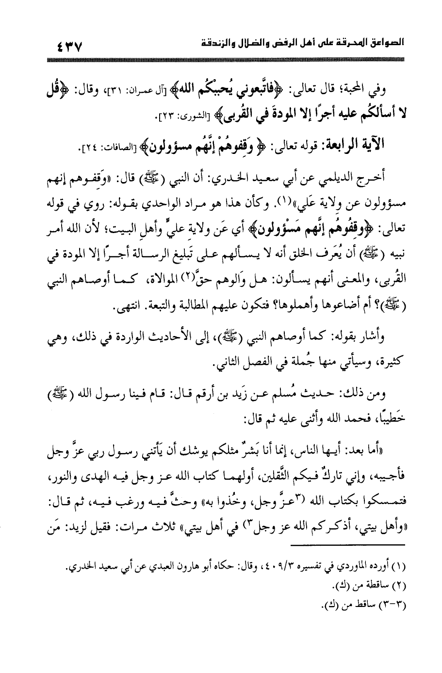 وَكَأن هَذَا هُوَ مُرَاد الواحدي بقوله رُوِيَ فِي قَوْله تَعَالَى {وقفوهم إِنَّهُم مسؤولون} أَي عَن ولَايَة عَليّ وَأهل الْبَيْت لِأَن الله أَمر نبيه صلى الله عَلَيْهِ وَسلم أَن يعرف الْخلق أَنه لَا يسألهم على تَبْلِيغ الرسَالَة أجرا إِلَّا الْمَوَدَّة فِي الْقُرْبَى وَالْمعْنَى أَنهم يسْأَلُون هَل وَالوهم حق الْمُوَالَاة كَمَا أوصاهم النَّبِي صلى الله عَلَيْهِ وَسلم أم أضاعوها وأهملوها فَتكون عَلَيْهِم الْمُطَالبَة والتبعة