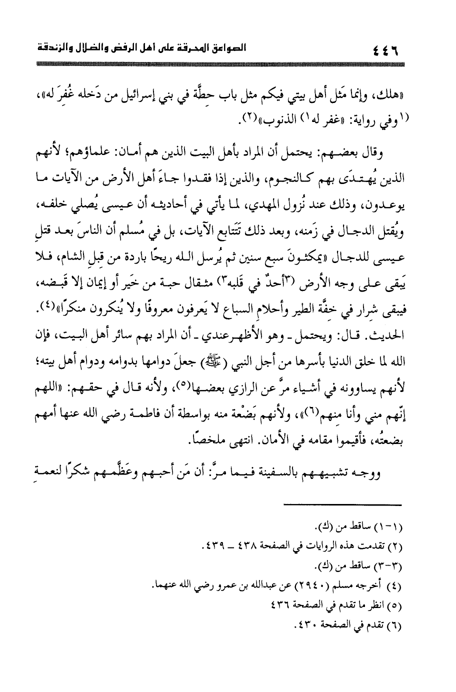 قَالَ وَيحْتَمل وَهُوَ الْأَظْهر عِنْدِي أَن المُرَاد بهم سَائِر أهل الْبَيْت فَإِن الله لما خلق الدُّنْيَا بأسرها من أجل النَّبِي صلى الله عَلَيْهِ وَسلم جعل دوامها بدوامه ودوام أهل بَيته لأَنهم يساوونه فِي أَشْيَاء مر عَن الرَّازِيّ بَعْضهَا وَلِأَنَّهُ قَالَ فِي حَقهم (اللَّهُمَّ إِنَّهُم مني وَأَنا مِنْهُم) وَلِأَنَّهُم بضعَة مِنْهُ بِوَاسِطَة أَن فَاطِمَة رَضِي الله عَنْهَا أمّهم بضعته فأقيموا مقَامه فِي الْأمان