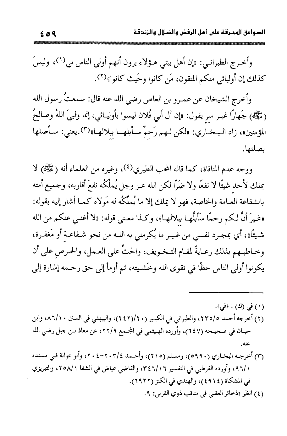 وَأخرج الشَّيْخَانِ عَن عَمْرو بن الْعَاصِ رَضِي الله عَنهُ قَالَ سَمِعت رَسُول الله صلى الله عَلَيْهِ وَسلم جهارا غير سر يَقُول (إِن آل أبي فلَان لَيْسُوا بأوليائي إِنَّمَا وليي الله وَصَالح الْمُؤمنِينَ) زَاد البُخَارِيّ (لَكِن لَهُم رحم سَأَبلُّهَا بِبلَالِهَا)