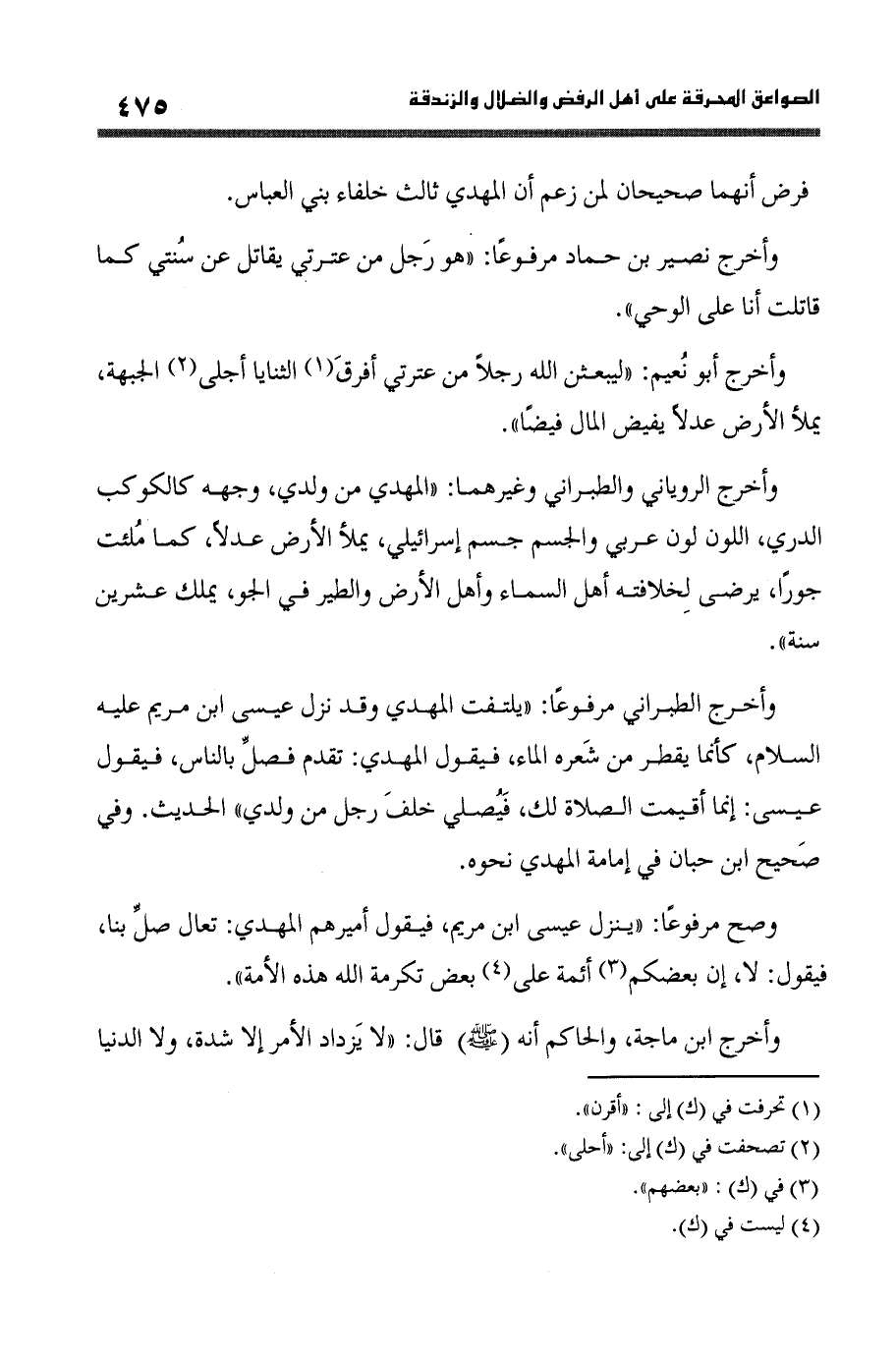 وَأخرج نصير بن حَمَّاد مَرْفُوعا (هُوَ رجل من عِتْرَتِي يُقَاتل عَن سنتي كَمَا قَاتَلت انا على الْوَحْي