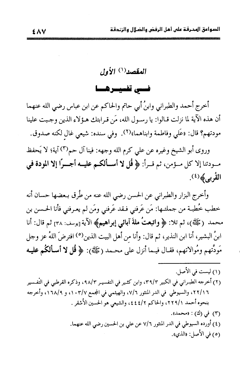 وروى أَبُو الشَّيْخ وَغَيره عَن عَليّ كرم الله وَجهه فِينَا آل حم آيَة لَا يحفظ مودتنا إِلَى كل مُؤمن ثمَّ قَرَأَ (قل لَا أَسأَلكُم عَلَيْهِ أجرا إِلَّا الْمَوَدَّة فِي الْقُرْبَى)