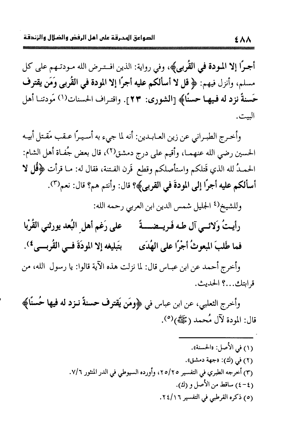 أجرا إِلَّا الْمَوَدَّة فِي الْقُرْبَى) وَفِي رِوَايَة الَّذين افْترض الله مَوَدَّتهمْ على كل مُسلم وَأنزل فيهم {قل لَا أَسأَلكُم عَلَيْهِ أجرا إِلَّا الْمَوَدَّة فِي الْقُرْبَى وَمن يقترف حَسَنَة نزد لَهُ فِيهَا حسنا} الشورى 23 واقتراف الْحَسَنَات مودتنا أهل الْبَيْت