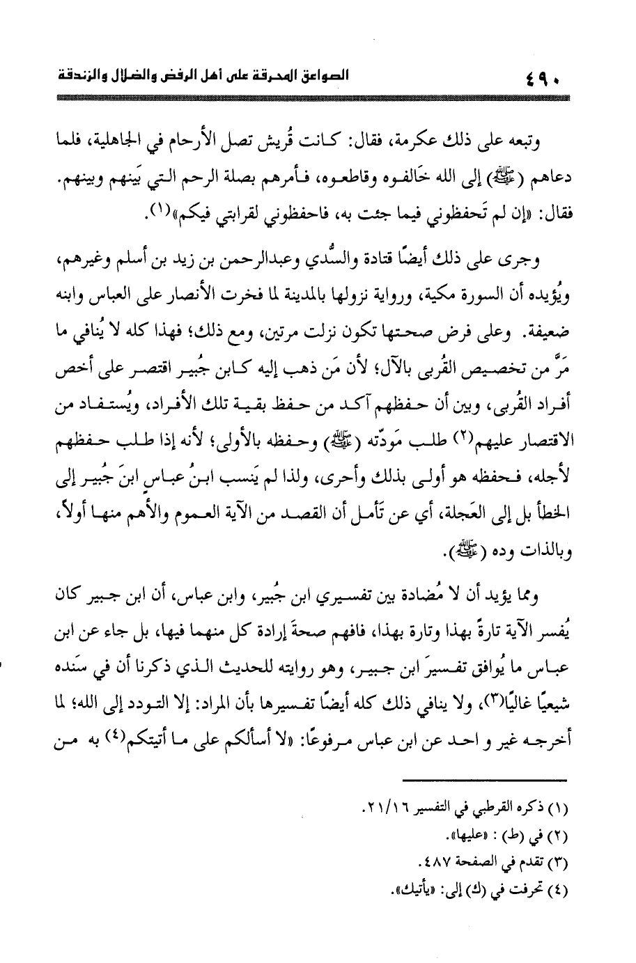 وعَلى فرض صِحَّتهَا تكون نزلت مرَّتَيْنِ وَمَعَ ذَلِك فَهَذَا كُله لَا يُنَافِي مَا مر من تَخْصِيص الْقُرْبَى بالآل لِأَن من ذهب إِلَيْهِ كَابْن جُبَير اقْتصر على أخص أَفْرَاد الْقُرْبَى وَبَين أَن حفظهم آكِد من حفظ بَقِيَّة تِلْكَ الْأَفْرَاد وَيُسْتَفَاد من الِاقْتِصَار عَلَيْهِم طلب مودته صلى الله عَلَيْهِ وَسلم وَحفظه بِالْأولَى لِأَنَّهُ إِذا طلب حفظهم لأَجله فحفظه هُوَ أولى بذلك وَأَحْرَى وَلذَا لم ينْسب ابْن عَبَّاس ابْن جُبَير إِلَى الْخَطَأ بل إِلَى العجلة أَي عَن تَأمل ان الْقَصْد من الْآيَة الْعُمُوم والأهم مِنْهَا أَولا وبالذات وده صلى الله عَلَيْهِ وَسلم