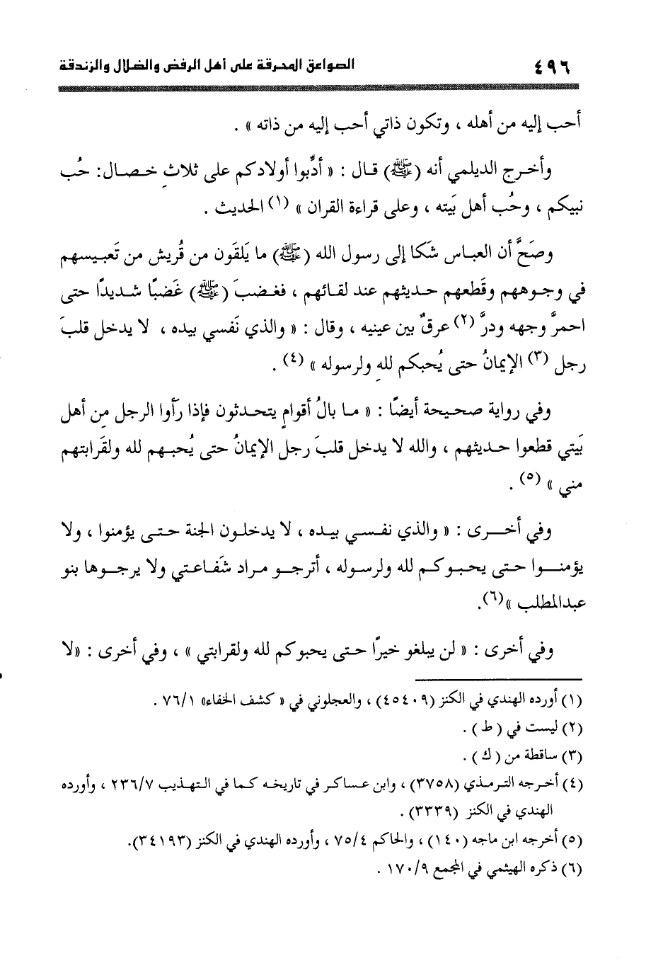 وَفِي رِوَايَة صَحِيحَة أَيْضا (مَا بَال أَقوام يتحدثون فَإِذا رَأَوْا الرجل من أهل بَيْتِي قطعُوا حَدِيثهمْ وَالله لَا يدْخل قلب رجل الْإِيمَان حَتَّى يُحِبهُمْ لله ولقرابتهم مني)