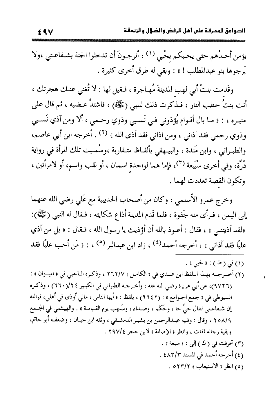 (لَا يُؤمن أحدهم حَتَّى يحبكم بحبي أترجون أَن تدْخلُوا الْجنَّة بشفاعتي وَلَا يرجوها بَنو عبد الْمطلب) وَبَقِي لَهُ طرق أُخْرَى كَثِيرَة