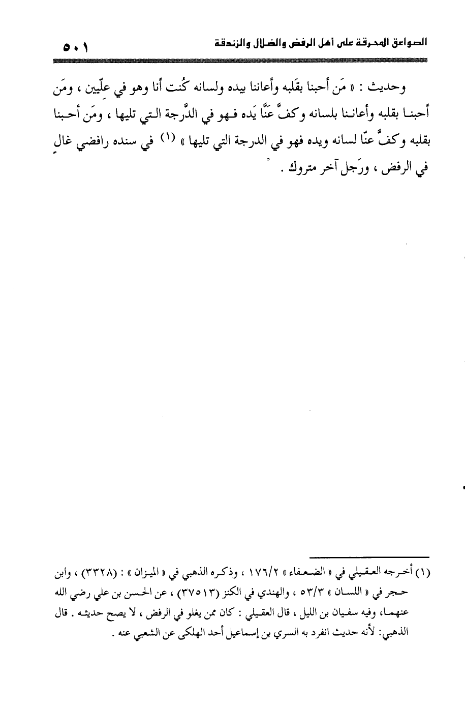 وَحَدِيث (من أحبنا بِقَلْبِه وأعاننا بِيَدِهِ وَلسَانه كنت أَنا وَهُوَ فِي عليين وَمن أحبنا بِقَلْبِه وأعاننا بِلِسَانِهِ وكف عَنَّا يَده فَهُوَ فِي الدرجَة الَّتِي تَلِيهَا وَمن أحبنا بِقَلْبِه وكف عَنَّا لِسَانه وَيَده فَهُوَ فِي الدرجَة الَّتِي تَلِيهَا) فِي سَنَده رَافِضِي غال فِي الرَّفْض وَرجل آخر مَتْرُوك
