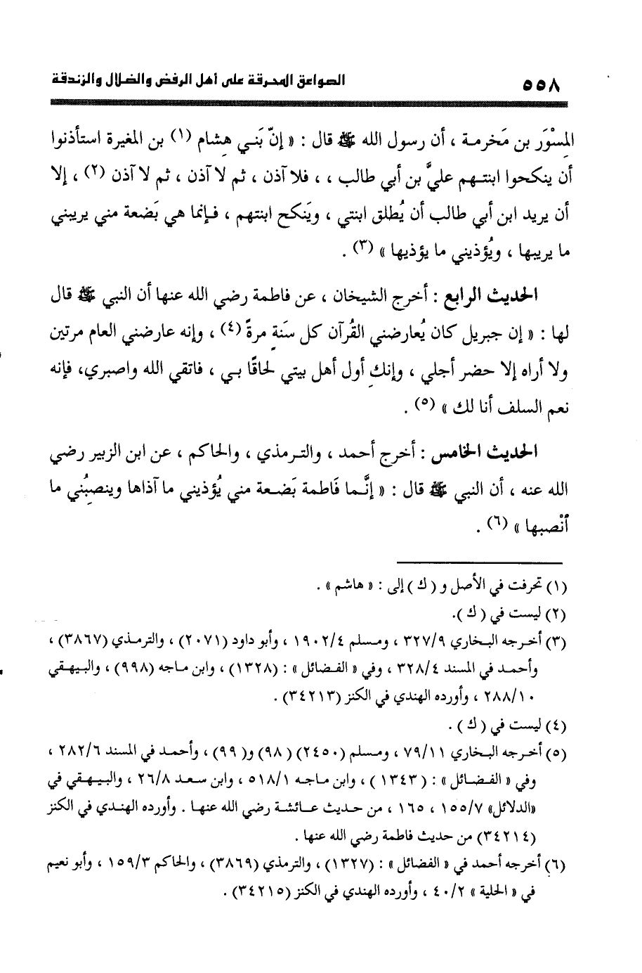 الحَدِيث الْخَامِس أخرج أَحْمد وَالتِّرْمِذِيّ وَالْحَاكِم عَن ابْن الزبير رَضِي الله عَنهُ أَن النَّبِي صلى الله عَلَيْهِ وَسلم قَالَ (إِنَّمَا فَاطِمَة بضعَة مني يُؤْذِينِي مَا آذاها وينصبني مَا أنصبها)
