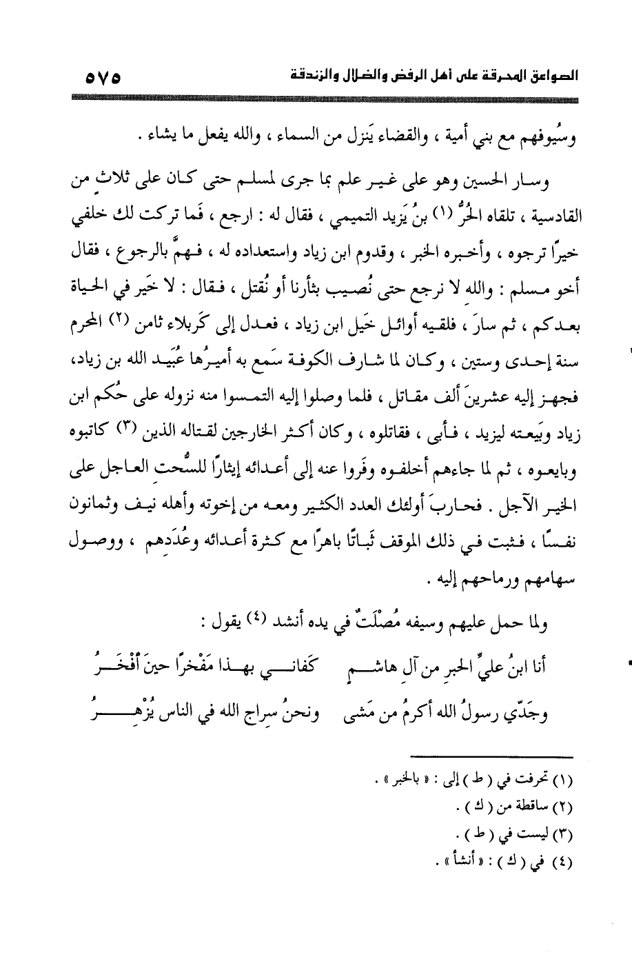 وَسَار الْحُسَيْن وَهُوَ على غير علم بِمَا جرى لمُسلم حَتَّى كَانَ على ثَلَاث من الْقَادِسِيَّة تَلقاهُ الْحر بن يزِيد التَّمِيمِي فَقَالَ ارْجع فَمَا تركت لَك خَلْفي خيرا ترجوه وَأخْبرهُ الْخَبَر وقدوم ابْن زِيَاد واستعداده لَهُ فهم بِالرُّجُوعِ بِالرُّجُوعِ فَقَالَ أَخُو مُسلم وَالله لَا نرْجِع حَتَّى نصيب بثأرنا أَو نقْتل فَقَالَ لَا خير فِي الْحَيَاة بعدكم ثمَّ سَار فَلَقِيَهُ أَوَائِل خيل ابْن زِيَاد فَعدل إِلَى كربلاء ثامن الْمحرم سنة إِحْدَى وَسِتِّينَ وَكَانَ لما شَارف الْكُوفَة سمع بِهِ أميرها عبيد الله بن زِيَاد فَجهز إِلَيْهِ عشْرين ألف مقَاتل فَلَمَّا وصلوا إِلَيْهِ التمسوا مِنْهُ نُزُوله على حكم ابْن زِيَاد وبيعته ليزِيد فابى فقاتلوه وَكَانَ أَكثر الخارجين لقتاله الَّذين كاتبوه وَبَايَعُوهُ ثمَّ لما جَاءَهُم أخلفوه وفروا عَنهُ إِلَى أعدائه إيثارا للسحت العاجل على الْخَيْر الآجل
