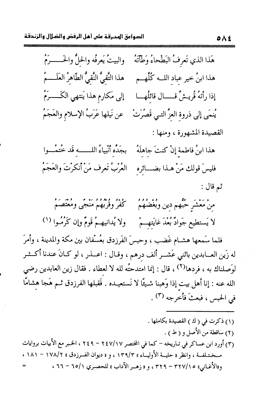 فَلَمَّا سَمعهَا هِشَام غضب وَحبس الفرزدق بعسفان بَين مَكَّة وَالْمَدينَة وامر لَهُ زين العابدين بِاثْنَيْ عشر ألف دِرْهَم وَقَالَ اعذر لَو كَانَ عندنَا أَكثر لوصلناك بِهِ فَردهَا قَالَ إِنَّمَا امتدحه لله لَا لعطاء