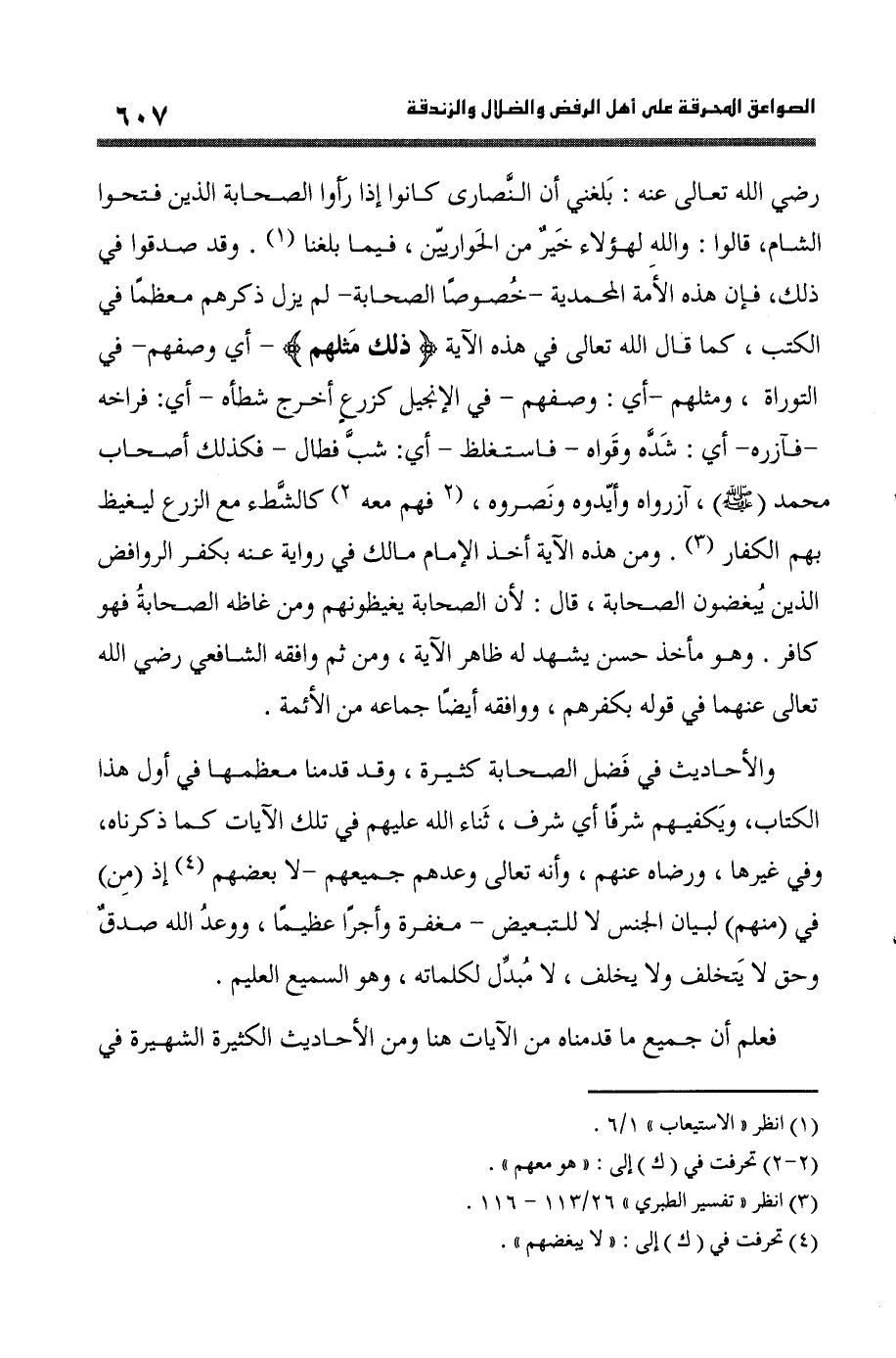 وَمن هَذِه الْآيَة أَخذ الإِمَام مَالك فِي رِوَايَة عَنهُ بِكفْر الروافض الَّذين يبغضون الصَّحَابَة قَالَ لِأَن الصَّحَابَة يغيظونهم وَمن غاظه الصَّحَابَة فَهُوَ كَافِر