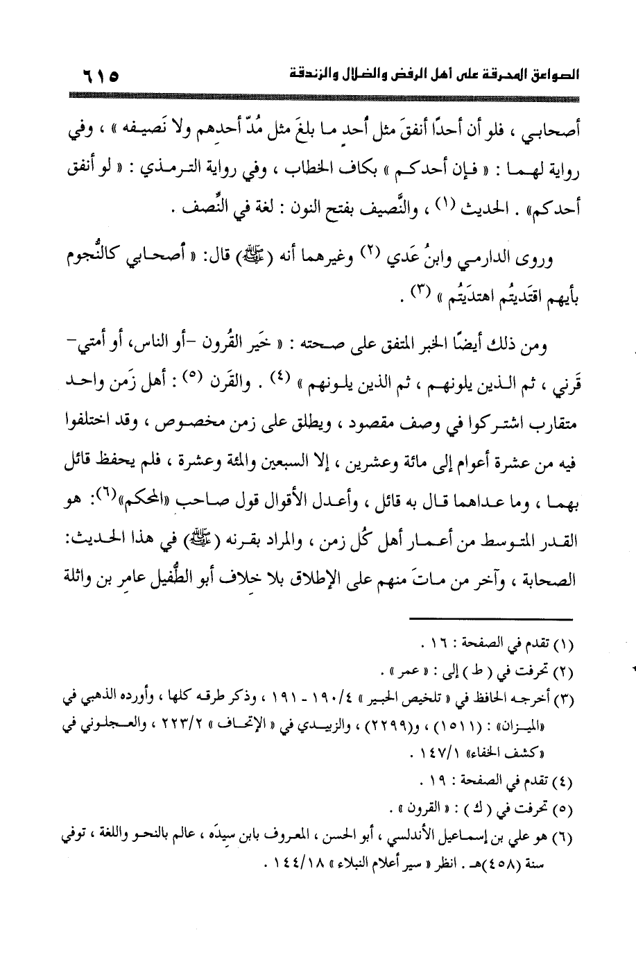 وروى الدَّارمِيّ وَابْن عدي وَغَيرهمَا أَنه صلى الله عَلَيْهِ وَسلم قَالَ (أَصْحَابِي كَالنُّجُومِ بِأَيِّهِمْ اقْتَدَيْتُمْ اهْتَدَيْتُمْ)