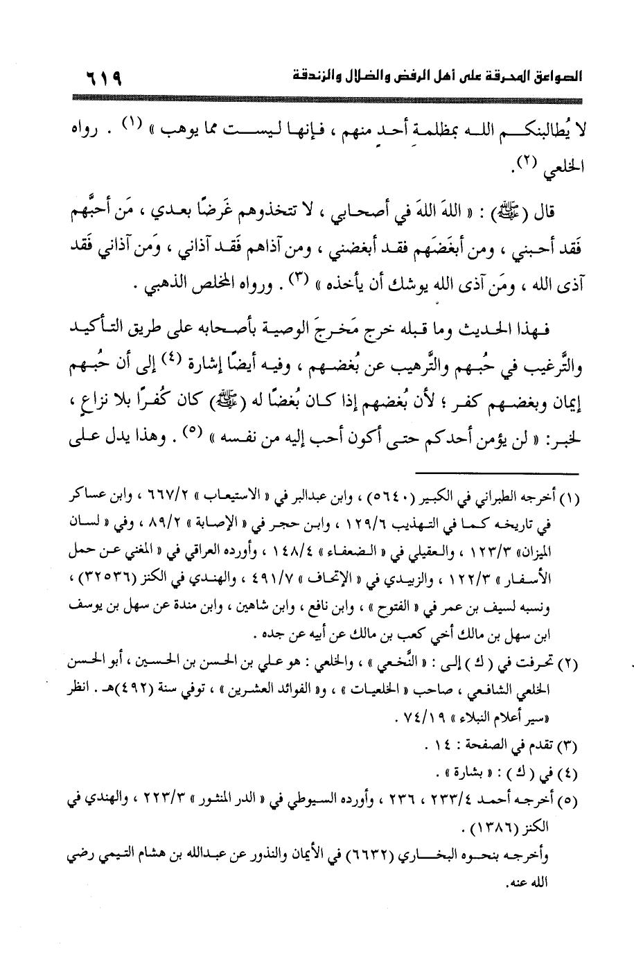 قَالَ صلى الله عَلَيْهِ وَسلم (الله الله فِي أَصْحَابِي لَا تتخذوهم غَرضا بعدِي من أحبهم فقد أَحبَّنِي وَمن أبْغضهُم فقد أبغضني وَمن آذاهم فقد آذَانِي وَمن آذَانِي فقد آذَى الله وَمن آذَى الله يُوشك أَن يَأْخُذهُ)