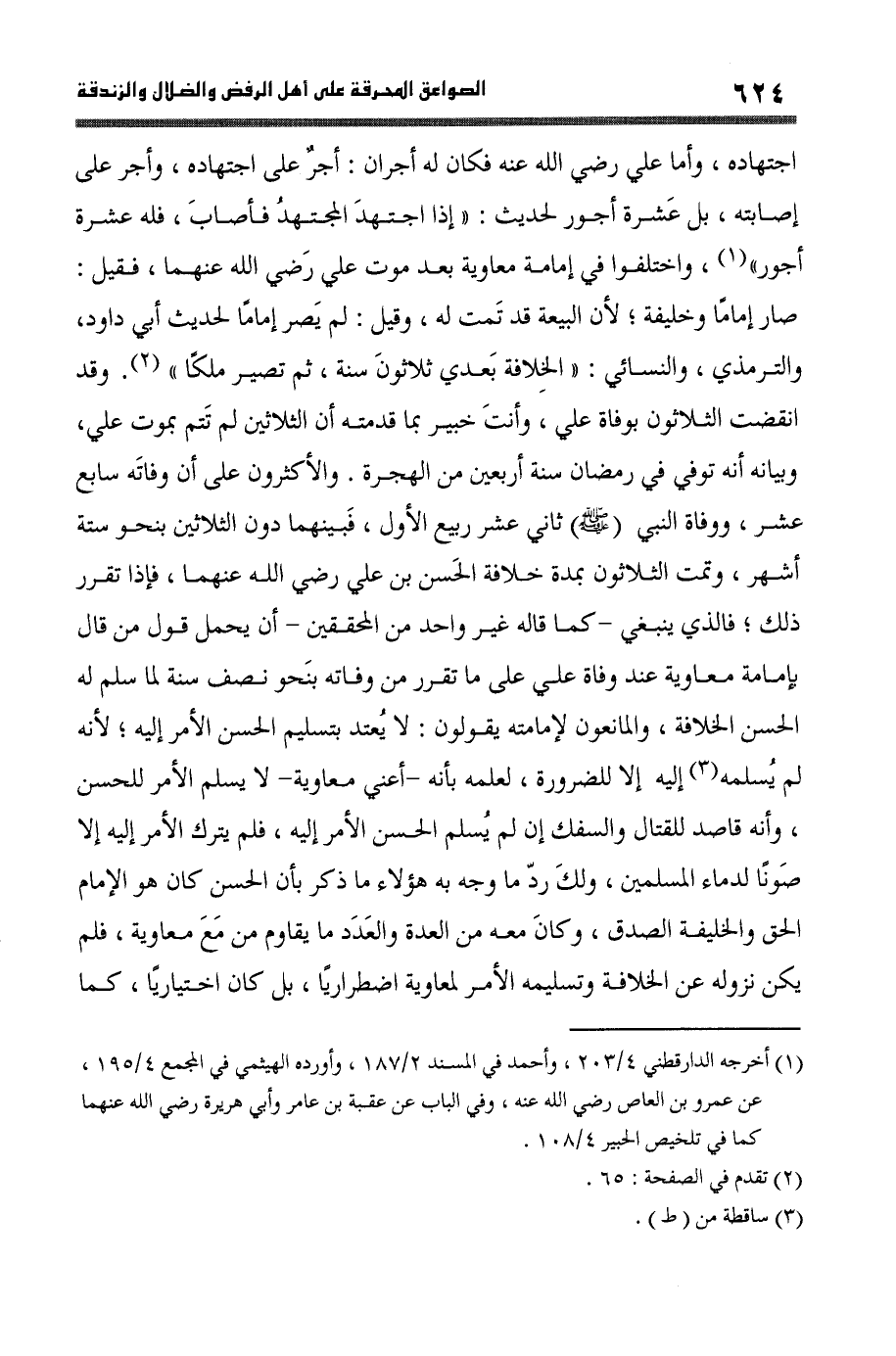 اجْتِهَاده وَأما عَليّ رَضِي الله عَنهُ فَكَانَ لَهُ أَجْرَانِ أجر على اجْتِهَاده وَأجر على إِصَابَته بل عشرَة أجور لحَدِيث (إِذا اجْتهد الْمُجْتَهد فَأصَاب فَلهُ عشرَة أجور) وَاخْتلفُوا فِي إِمَامَة مُعَاوِيَة بعد موت عَليّ رَضِي الله عَنْهُمَا فَقيل صَار إِمَامًا وَخَلِيفَة لِأَن الْبيعَة قد تمت لَهُ وَقيل لم يصر إِمَامًا لحَدِيث أبي دَاوُد وَالتِّرْمِذِيّ وَالنَّسَائِيّ (الْخلَافَة بعدِي ثَلَاثُونَ سنة ثمَّ تصير ملكا)