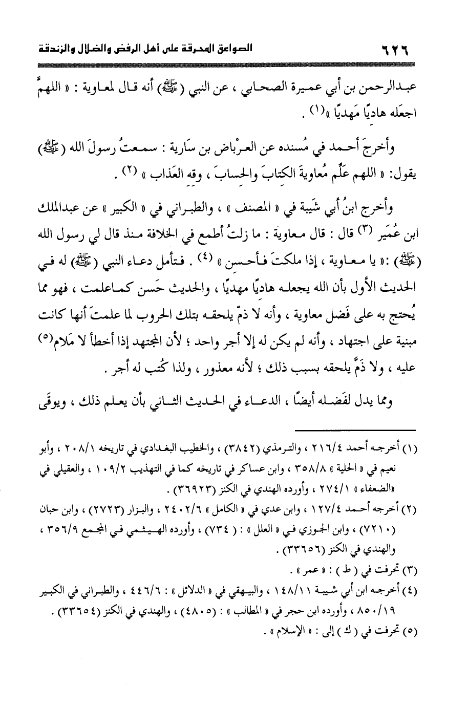 وَأخرج أَحْمد فِي مُسْنده عَن الْعِرْبَاض بن سَارِيَة سَمِعت رَسُول الله صلى الله عَلَيْهِ وَسلم يَقُول (اللَّهُمَّ علم مُعَاوِيَة الْكتاب والحساب وقه الْعَذَاب)