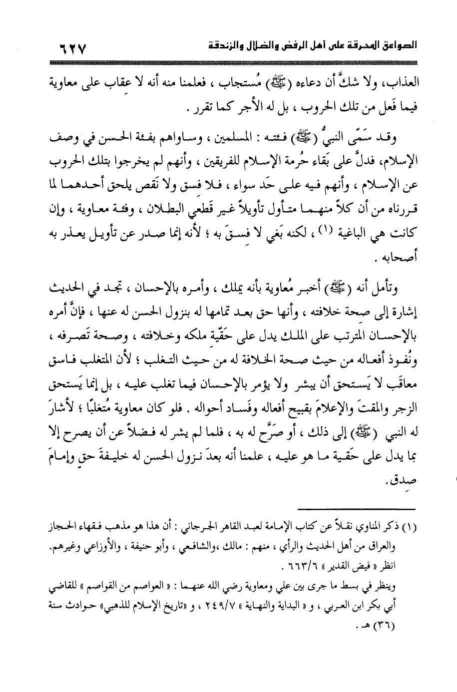فَلَو كَانَ مُعَاوِيَة متغلبا لأشار لَهُ النَّبِي صلى الله عَلَيْهِ وَسلم إِلَى ذَلِك أَو صرح لَهُ بِهِ فَلَمَّا لم يشر لَهُ فضلا عَن أَن يُصَرح إِلَّا بِمَا يدل على حقية مَا هُوَ عَلَيْهِ علمنَا أَنه بعد نزُول الْحسن لَهُ خَليفَة حق وَإِمَام صدق
