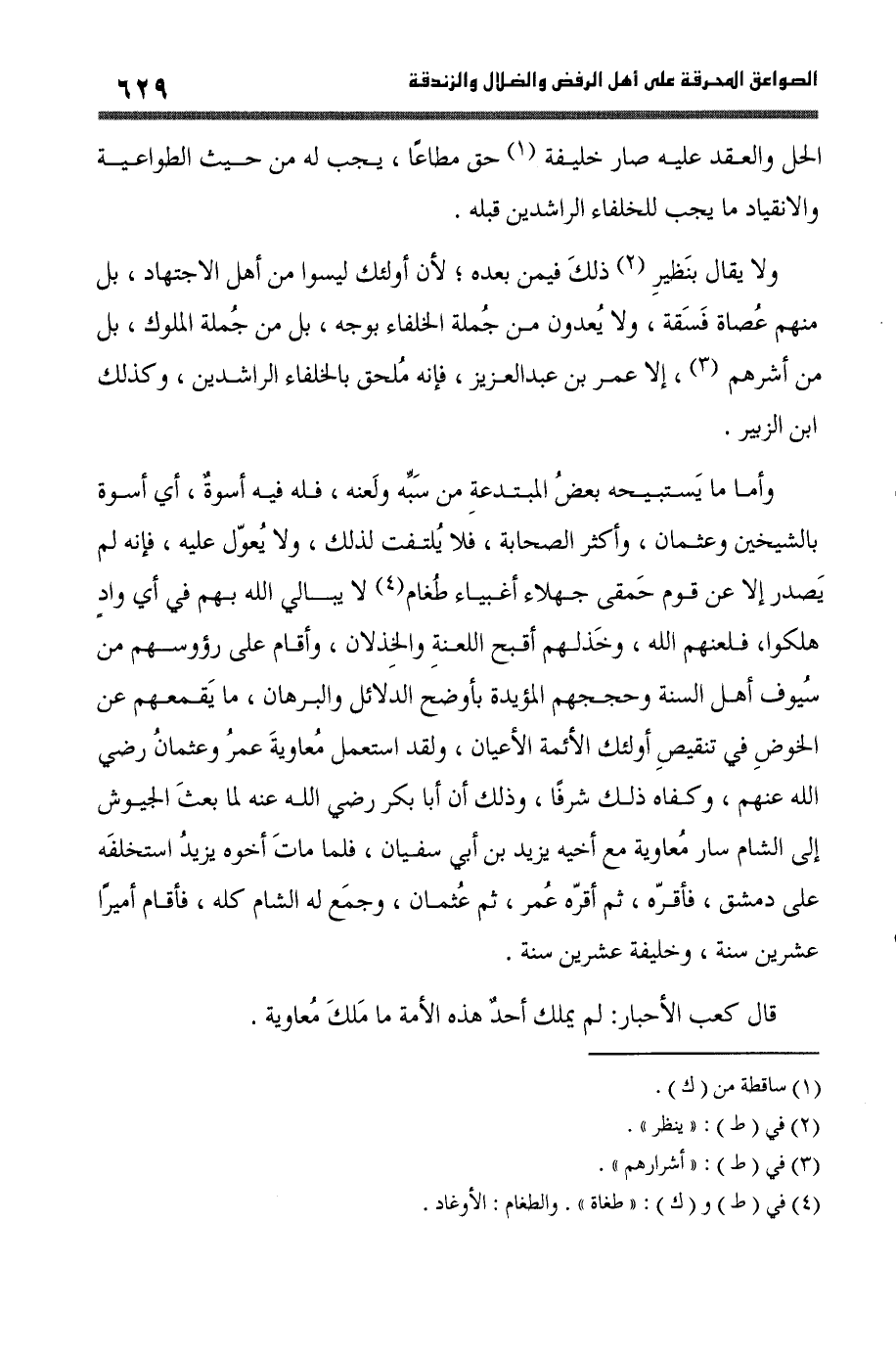 وَأما مَا يستبيحه بعض المبتدعة من سبه ولعنه فَلهُ فِيهِ اسوة أَي أُسْوَة بالشيخين وَعُثْمَان وَأكْثر الصَّحَابَة فَلَا يلْتَفت لذَلِك وَلَا يعول عَلَيْهِ فَإِنَّهُ لم يصدر إِلَّا عَن قوم حمقى جهلاء أغبياء طغام لَا يُبَالِي الله بهم فِي أَي وَاد هَلَكُوا فلعنهم الله وخذلهم أقبح اللَّعْنَة والخذلان وَأقَام على رؤوسهم من سيوف أهل السّنة وحججهم المؤيدة بأوضح الدَّلَائِل والبرهان مَا يقمعهم عَن الْخَوْض فِي تنقيص أُولَئِكَ الْأَئِمَّة الْأَعْيَان وَلَقَد اسْتعْمل مُعَاوِيَة عمر وَعُثْمَان رَضِي الله عَنْهُم وَكَفاهُ ذَلِك شرفا وَذَلِكَ أَن أَبَا بكر رَضِي الله عَنهُ لما بعث الجيوش إِلَى الشَّام سَار مُعَاوِيَة مَعَ أَخِيه يزِيد بن أبي سُفْيَان فَلَمَّا مَاتَ أَخُوهُ يزِيد اسْتَخْلَفَهُ على دمشق فأقره ثمَّ أقره عمر ثمَّ عُثْمَان وَجمع لَهُ الشَّام كُله فَأَقَامَ أَمِيرا عشْرين سنة وَخَلِيفَة عشْرين سنة