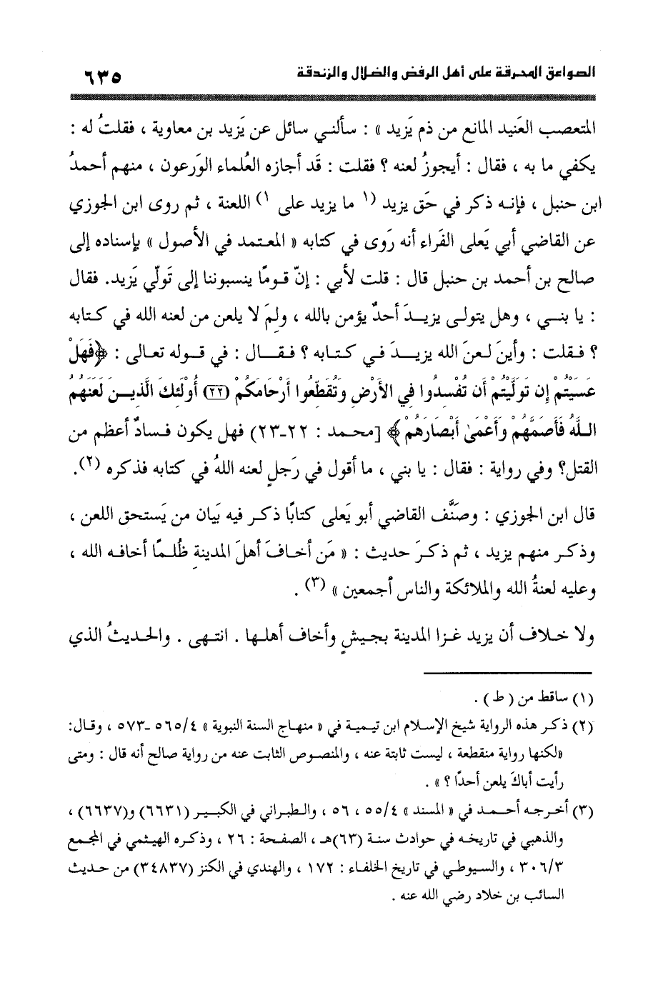 المتعصب العنيد الْمَانِع من ذمّ يزِيد سَأَلَني سَائل عَن يزِيد بن مُعَاوِيَة فَقَالَ لَهُ يَكْفِي مَا بِهِ فَقَالَ أَيجوزُ لَعنه فَقلت قد أجَازه الْعلمَاء الورعون مِنْهُم أَحْمد ابْن حَنْبَل فَإِنَّهُ ذكر فِي حق يزِيد مَا يزِيد على اللَّعْنَة ثمَّ روى ابْن الْجَوْزِيّ عَن القَاضِي أبي يعلى الْفراء أَنه روى فِي كِتَابه الْمُعْتَمد فِي الْأُصُول بِإِسْنَادِهِ إِلَى صَالح بن أَحْمد بن حَنْبَل قَالَ قلت لأبي إِن قوما ينسبوننا إِلَى تولي يزِيد