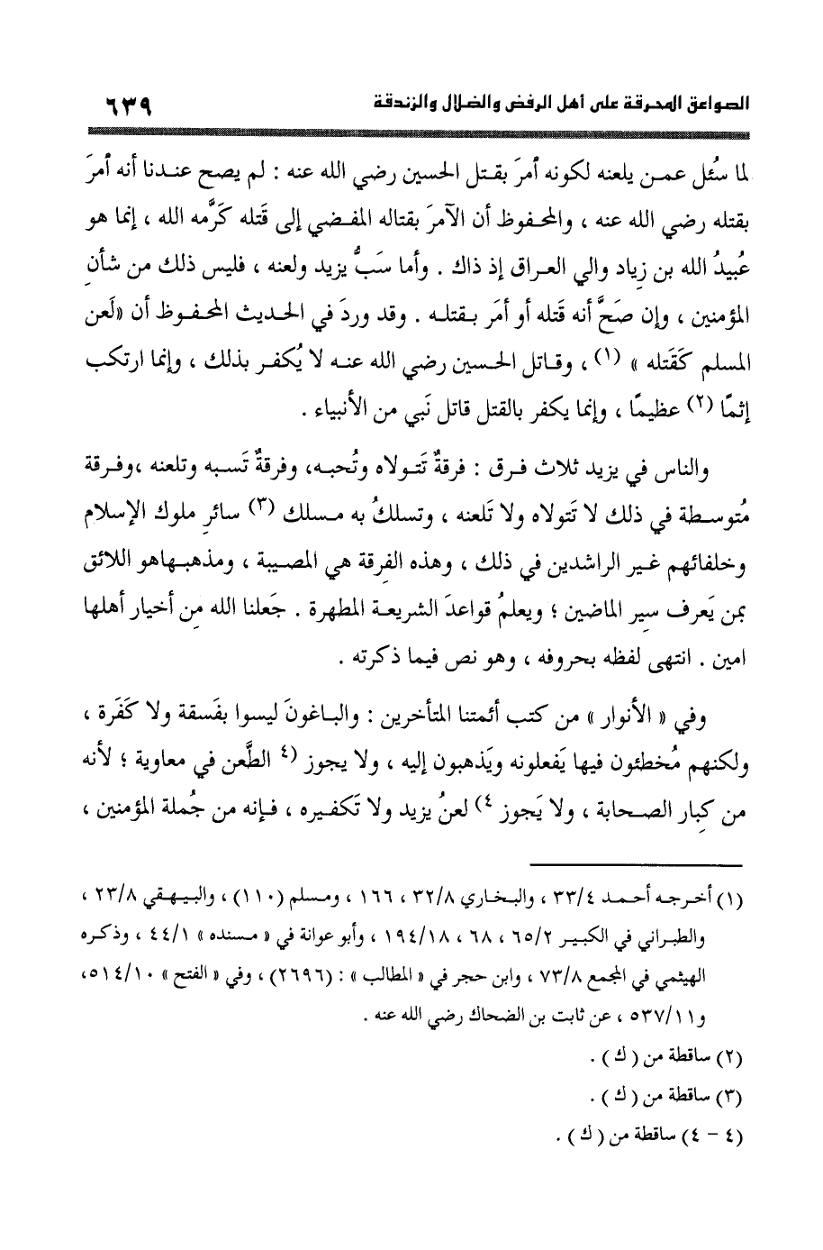 وَقد ورد فِي الحَدِيث الْمَحْفُوظ أَن (لعن الْمُسلم كقتله) وَقَاتل الْحُسَيْن رَضِي الله عَنهُ لَا يكفر بذلك وَإِنَّمَا ارْتكب إِثْمًا عَظِيما وَإِنَّمَا يكفر بِالْقَتْلِ قَاتل نَبِي من الْأَنْبِيَاء