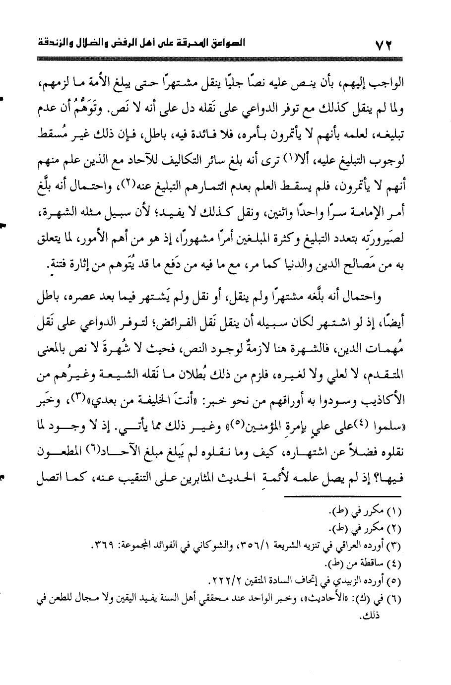 وَاحْتِمَال أَنه بلغه مشتهرا وَلم ينْقل أَو نقل وَلم يشْتَهر فِيمَا بعد عصره بَاطِل أَيْضا إِذْ لَو اشْتهر لَكَانَ سَبيله أَن ينْقل نقل الْفَرَائِض لتوفر الدَّوَاعِي على نقل مهمات الدّين فالشهرة هُنَا لَازِمَة لوُجُود النَّص فَحَيْثُ لَا شهرة لَا نَص بِالْمَعْنَى الْمُتَقَدّم لَا لعَلي وَلَا لغيره فَلَزِمَ من ذَلِك بطلَان مَا نَقله الشِّيعَة وَغَيرهم من الأكاذيب وسودوا بِهِ أوراقهم من نَحْو خبر أَنْت الْخَلِيفَة من بعدِي وَخبر سلمُوا على عَليّ بإمرة الْمُؤمنِينَ وَغير ذَلِك مِمَّا يَأْتِي إِذْ لَا وجود لما نقلوه فضلا عَن اشتهاره كَيفَ وَمَا نقلوه لم يبلغ مبلغ الْآحَاد المطعون فِيهَا إِذْ لم يصل علمه لأئمة الحَدِيث المثابرين على التنقيب عَنهُ كَمَا اتَّصل