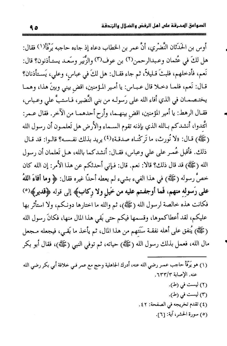 أَوْس بن الْحدثَان النضري أَن عمر بن الْخطاب دَعَاهُ إِذْ جَاءَهُ حَاجِبه يرفأ فَقَالَ هَل لَك فِي عُثْمَان وَعبد الرَّحْمَن بن عَوْف وَالزُّبَيْر وَسعد يستأذنون قَالَ نعم فأدخلهم فَلبث قَلِيلا ثمَّ جَاءَ فَقَالَ هَل لَك فِي عَبَّاس وَعلي يستأذنان قَالَ نعم فَلَمَّا دخلا قَالَ عَبَّاس يَا أَمِير الْمُؤمنِينَ اقْضِ بيني وَبَين هَذَا وهما يختصمان فِي الَّذِي أَفَاء الله على رَسُوله من بني النَّضِير فاستب عَليّ وعباس فَقَالَ الرَّهْط يَا أَمِير الْمُؤمنِينَ اقْضِ بَينهمَا وأرح أَحدهمَا من الآخر فَقَالَ عمر اتئدوا أنْشدكُمْ بِاللَّه الَّذِي بِإِذْنِهِ تقوم السَّمَاء وَالْأَرْض هَل تعلمُونَ أَن رَسُول الله صلى الله عَلَيْهِ وَسلم قَالَ (لَا نورث مَا تَرَكْنَاهُ صَدَقَة) يُرِيد بذلك نَفسه قَالُوا قد قَالَ ذَلِك فَأقبل عمر على عَليّ وعباس فَقَالَ أنشدكما بِاللَّه هَل تعلمان أَن رَسُول الله صلى الله عَلَيْهِ وَسلم قد قَالَ ذَلِك قَالَا نعم قَالَ فَإِنِّي أحدثكُم عَن هَذَا الْأَمر إِن الله كَانَ خص رَسُوله صلى الله عَلَيْهِ وَسلم فِي هَذَا الْفَيْء بِشَيْء لم يُعْطه أحدا غَيره فَقَالَ وَمَا أَفَاء الله على رَسُوله مِنْهُم فَمَا أَوجَفْتُمْ عَلَيْهِ من خيل وَلَا ركاب إِلَى قَوْله {قدير} فَكَانَت هَذِه خَالِصَة لرَسُول الله صلى الله عَلَيْهِ وَسلم ثمَّ وَالله مَا اخْتَارَهَا دونكم وَلَا اسْتَأْثر بهَا عَلَيْكُم لقد أعطاكموها وَقسمهَا فِيكُم حَتَّى بَقِي هَذَا المَال مِنْهَا فَكَانَ رَسُول الله صلى الله عَلَيْهِ وَسلم ينْفق على أَهله نَفَقَة سنتهمْ من هَذَا المَال ثمَّ يَأْخُذ مَا بَقِي فَيَجْعَلهُ مجعل مَال الله فَعمل بذلك رَسُول الله صلى الله عَلَيْهِ وَسلم حَيَاته ثمَّ توفّي النَّبِي صلى الله عَلَيْهِ وَسلم فَقَالَ أَبُو بكر