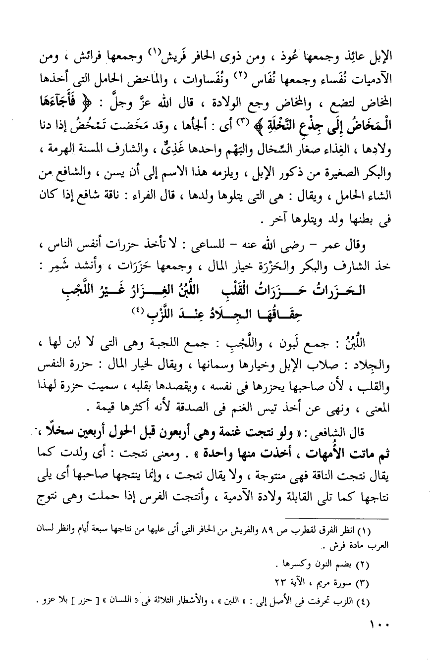 الإبل عائذ وجمعها عوذ ومن ذوي الحافر فريش1 وجمعها فرش ومن الادميات نفساء وجمعها نفاس2 ونفساوات والماخض الحامل التي اخذها المخاض لتضع والمخاض وجع الولادة قال الله عز وجل: {فَأَجَاءَهَا الْمَخَاضُ إلى جِذْعِ النَّخْلَةِ} 3 أي الجأها وقد مخضت تمخض إذا دنا ولادها والغذاء صغار السخال والبهم واحدها غذي والشارف المسنة الهرمة والبكرة الصغيرة من ذكور الإبل ويلزمه هذا الإسم إلى أن يسن والشافع من الشاء الحامل ويقال: هي التي يتلوها ولدها قال الفراء: ناقة شافع إذا كان في بطنها ولد ويتلوها آخر.