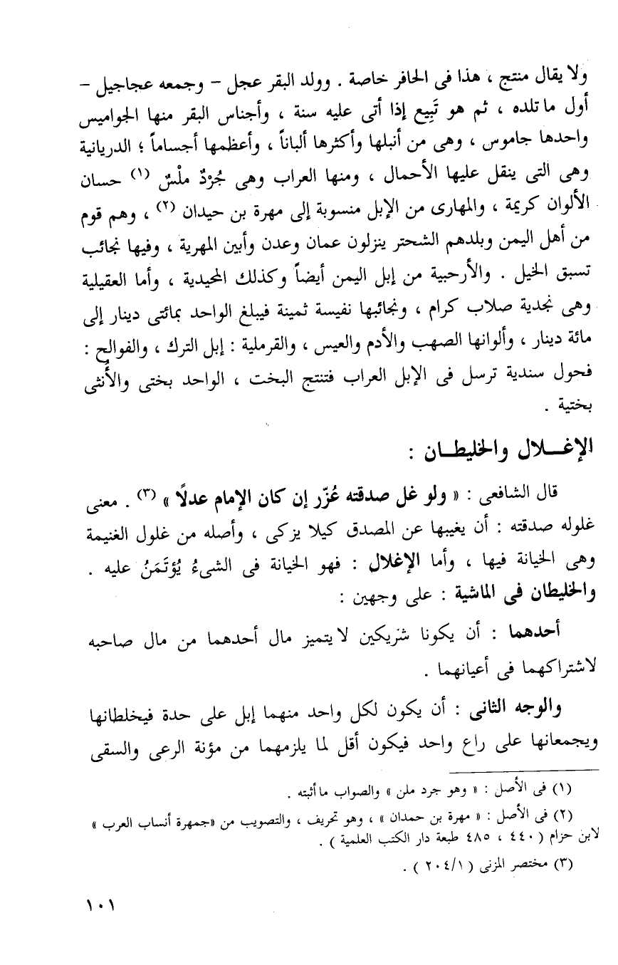 ولا يقال منتج هذا في الحافر خاصه وولد البقره عجل وجمعه عجاجيل وعجول اول ما تلده ثم هو تبيع إذا اتى عليه سنه واجناس البقر منها الجواميس واحدها جاموس وهي من انبلها واكرمها واكثرها البانا واعظمها اجساما ومنها الدربانيه وهي التي تنقل عليها الاحمال ومنها العراب وهي جرد ملس1 حسان الالوان الكريمه والمهارى من الابل منسوبة إلى مهرة بن حيدان2 وهم قوم من أهل اليمن وبلادهم الشحر بين عمان وعدن ابين ابلهم المهريه وفيها نجائب تسبق الخيل والارحيبه من ابل اليمن ايضا وكذلك المجيديه