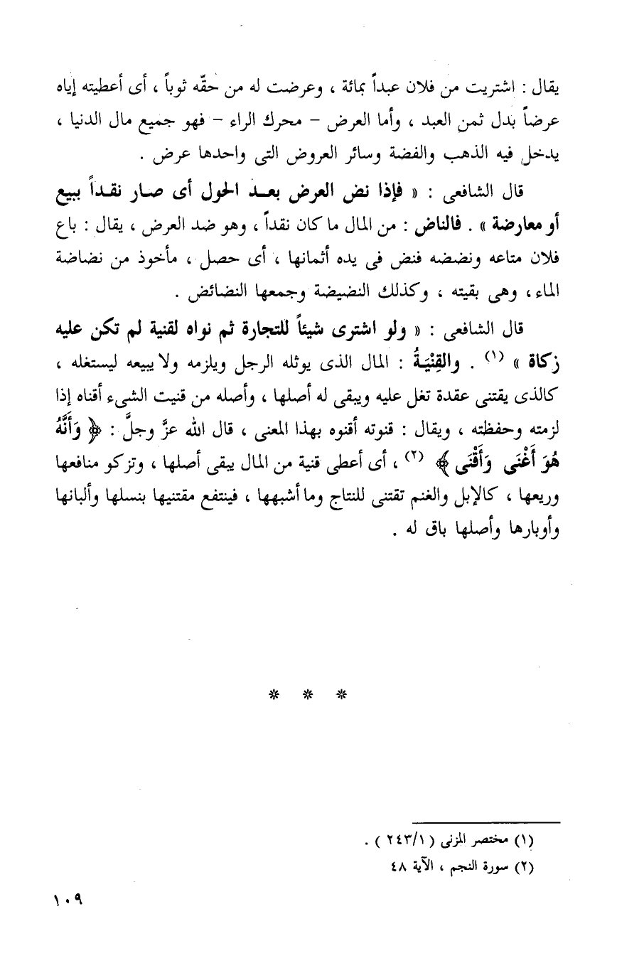 قال الشافعي: "ولو اشترى شيئا للتجاره ثم نواه لقنيه لم يكن عليه زكاه"1 والقنيه المال الذي يؤثله الرجل ويلزمه ولا يبعه ليستغله كالذي يقتني عقدة تغل عليه ويبقى له اصلها واصله من قنيت الشيء اقناه إذا لزمته وحفظته ويقال قنوته اقنوه بهذا المعنى قال الله عز وجل: {وَأَنَّهُ هُوَ أَغْنَى وَأَقْنَى} 2 أي اعطى قنيه من المال يبقى اصلها وتزكو منافعها وريعها كالابل والغنم تقتنى للنتاج وما اشبهها فينتفع مقتنيها بنسلها والبانها وأوبارها وأصلها باق له.
