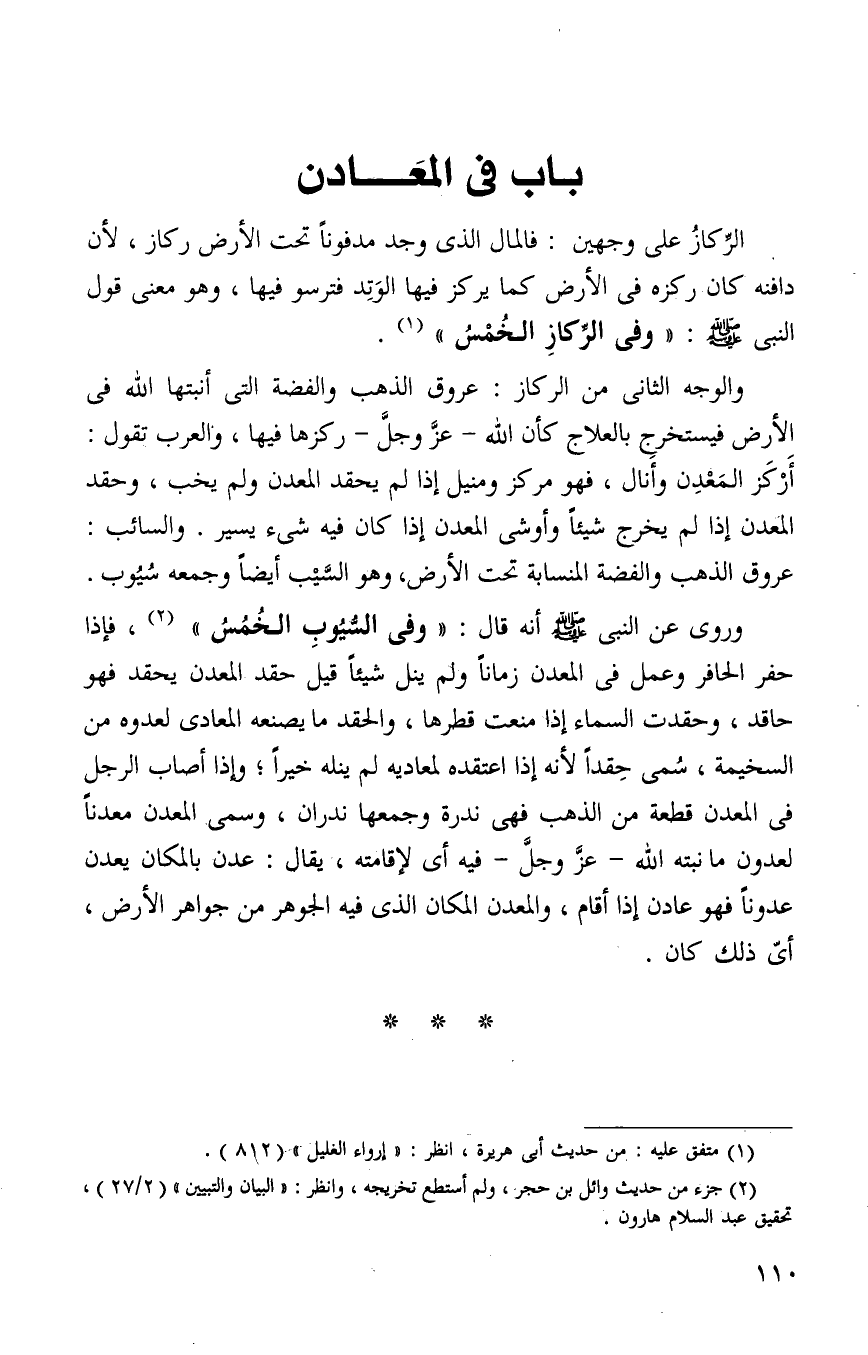 والوجه الثاني من الركاز: عروق الذهب والفضه التي أنبتها الله تعالى في الأرض فتستخرج بالعلاج كأن الله ركزها فيها والعرب تقول اركز المعدن وانال فهو مركز ومنيل إذا لم يحقد المعدن ولم يخب يقال حقد المعدن يحقد إذا لم يخرج شيئا واوشى المعدن إذا كان فيه شيء يسير والسام عروق الذهب والفضه المنسابه تحت الأرض وهو السيب ايضا وجمعه سيوب.