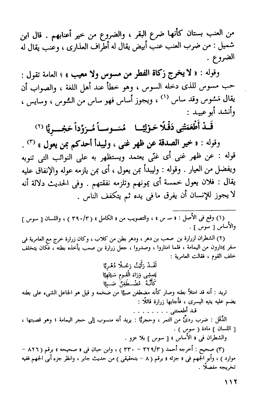وقوله: "لا يخرج زكاة الفطر من مسوس ولا معيب" العامه تقول: حب مسوس للذي دخله السوس وهو خطأ عند أهل اللغة والصواب أن يقال حب مسوس وقد ساس1 ويجوز اساس فهو مسيس ولغه ثالثه ساس الطعام يساس فهو ساس وسائس من السوس وانشد أبو عبيد: