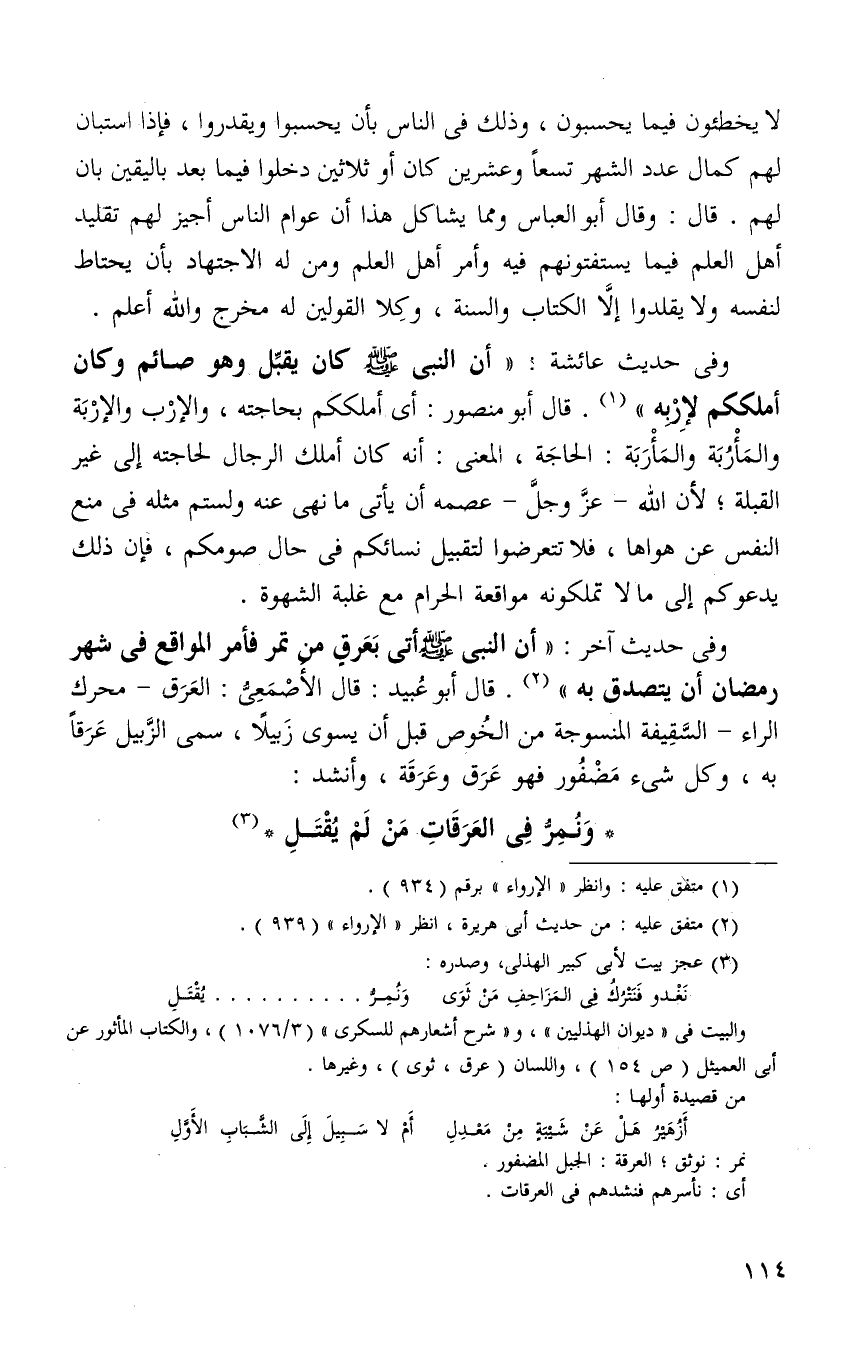 وفي حديث عائشه رضي الله عنها: "ان النبي صلى الله عليه وسلم كان يقبل وهو صائم وكان املككم لاربه" 1 قال أبو منصور: أي كان املككم لحاجته والارب والأرب والاربه والمأربه والماربه الحاجه المعنى انه كان املك الرجال لحاجته إلى غير القبله لان الله عز وجل عصمه أن يأتي ما نهى عنه ولستم مثله في منع النفس عن هواها فلا تتعرضوا لتقبيل نسائكم في حال صومكم فان ذلك يدعوكم إلى ما لا تملكون من مواقعة الحرام مع غلبة الشهوه.
