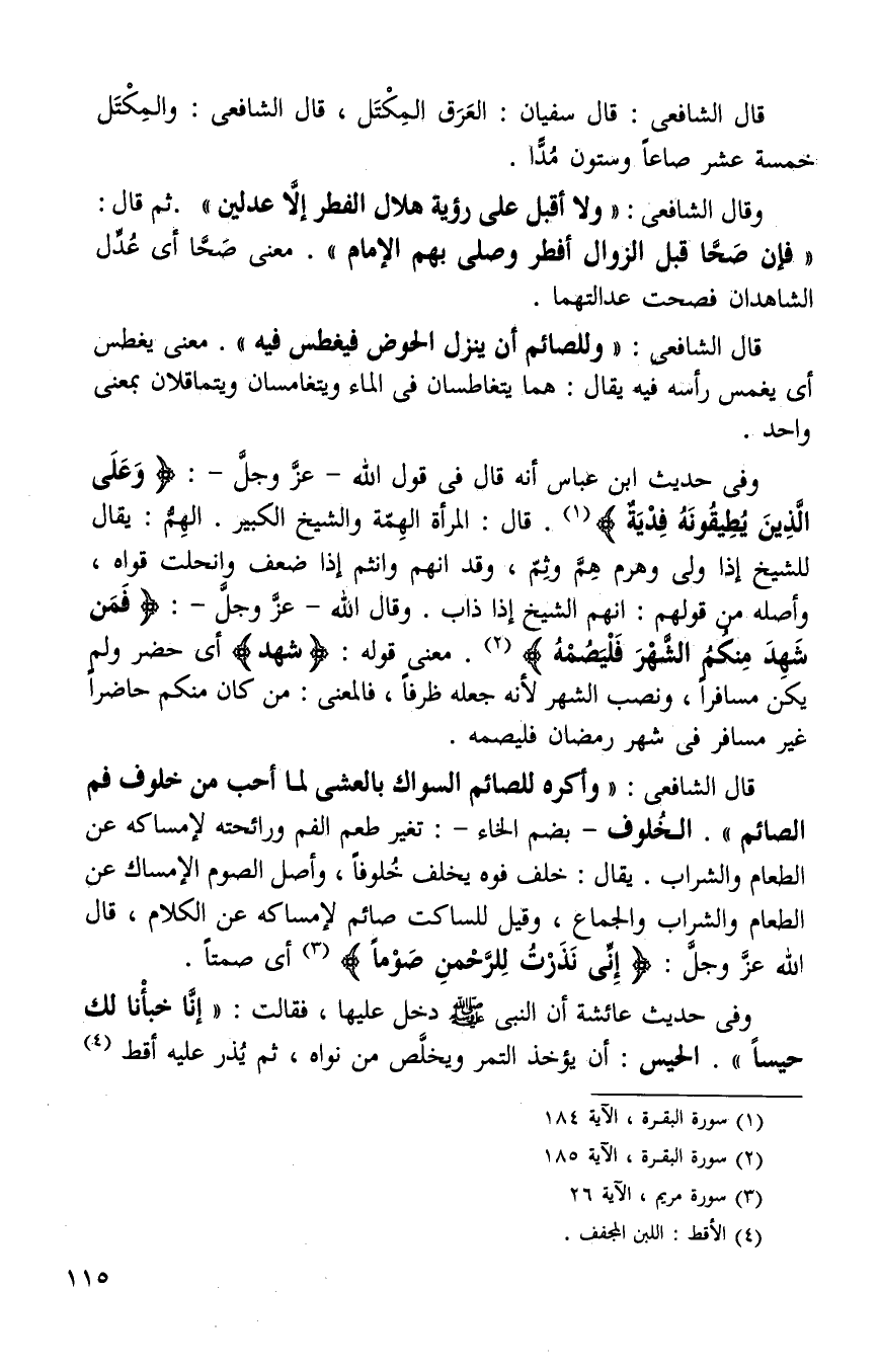 قال الشافعي: وللصائم أن ينزل الحوض فيغطس فيه معنى يغطس أي يغمس رأسه فيه يقال هما يتغاطسان في الماء ويتقامسان ويتماقلان بمعنى واحد وفي حديث ابن عباس انه قال في قوله عز وجل: {وَعَلَى الَّذِينَ يُطِيقُونَهُ فِدْيَةٌ} 1 قال المرأة الهمه والشيخ والشيخ الكبير الهم يقال للشيخ إذا ولى وهرم هم وثم وقد انهم وانثم إذا ضعف وانحلت قواه واصله من قولهم انهم الشحم إذا ذاب وقال الله عز وجل: {فَمَنْ شَهِدَ مِنْكُمُ الشَّهْرَ فَلْيَصُمْهُ} 2 معنى قوله {شَهِدَ} أي حضر ولم يكن مسافرا ونصب الشهر لأنه جعله ظرفا فالمعنى من كان منكم حاضرا غير مسافر في شهر رمضان فليصمه.