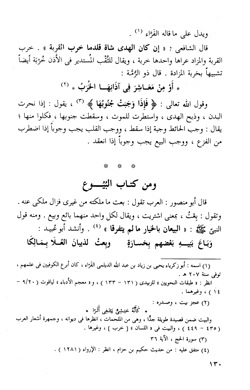 وقول الله عز وجل: {فَإِذَا وَجَبَتْ جُنُوبُهَا} 3 فكلوا منها يقول إذا نحرت البدن وذبح الهدى واسبطرت للموت وسقطت جنوبها فكلوا منها يقال وجب الحائط يجب وجبه إذا سقط ووجب القلب يجب وجيبا إذا اضطرب من الفزع ووجب البيع يجب وجوبا إذا انعقد.