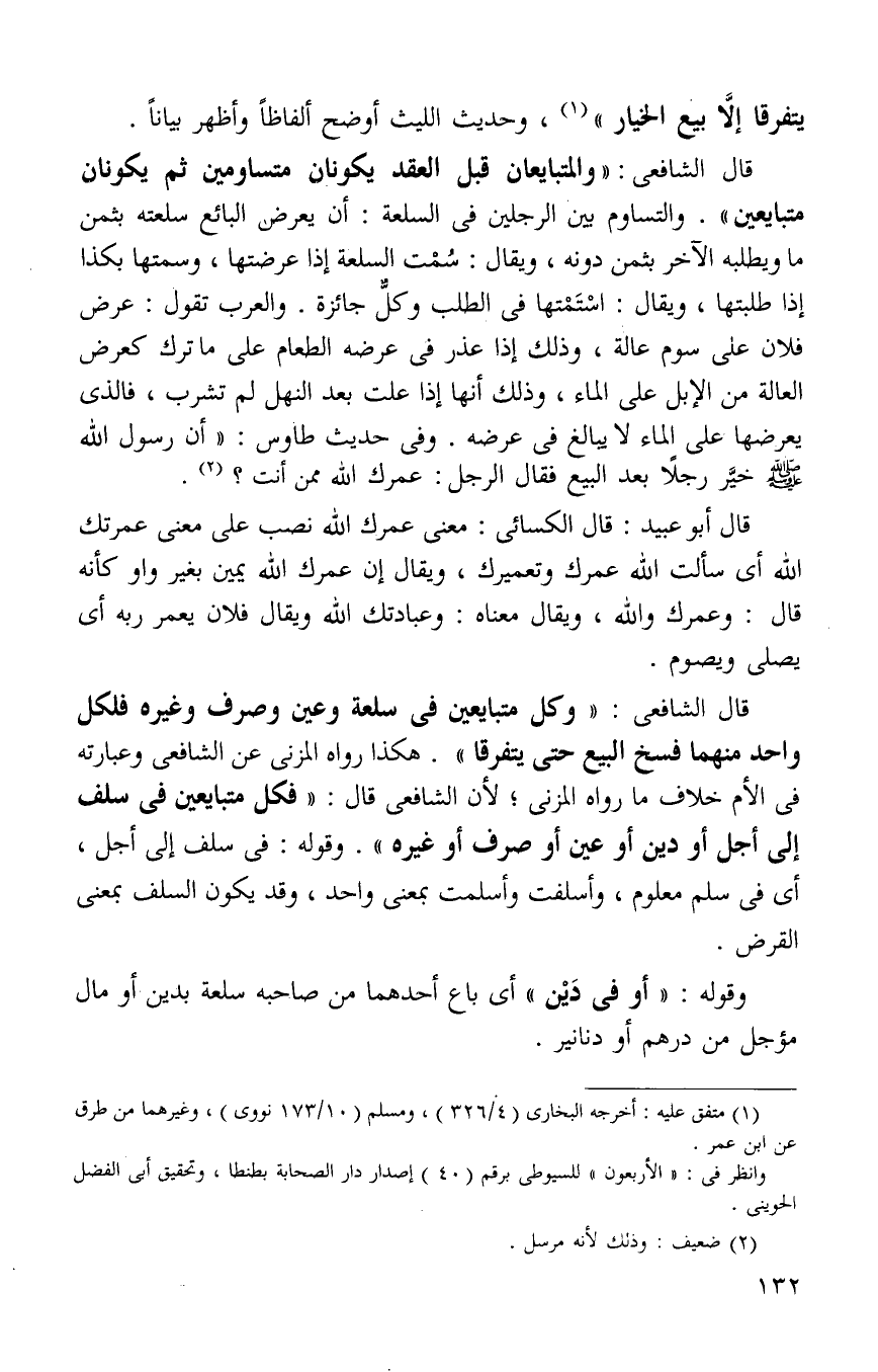 قال الشافعي: "وكل متبايعين في سلعة وعين وصرف وغيره فلكل واحد منهما فسخ البيع حتى يتفرقا" هكذا رواه المزنى عن الشافعي وعبارته في الام خلاف ما رواه المزنى لان الشافعي قال: "فكل متبايعين في سلف إلى اجل أو دين أو عين أو صرف أو غيره". فقوله في سلف إلى اجل أي في سلم إلى اجل معلوم واسلفت واسلمت بمعنى واحد وقد يكون السلف بمعنى القرض.