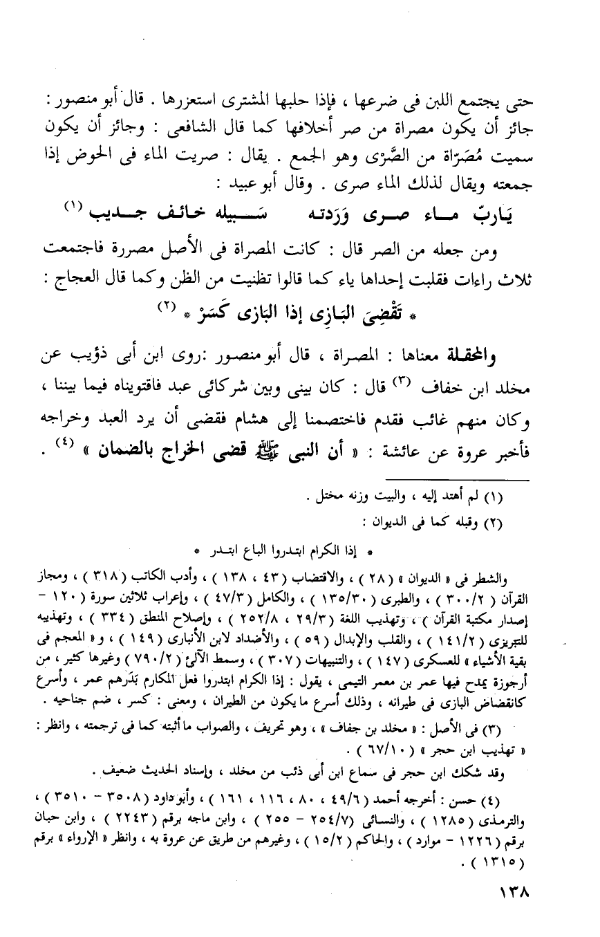 حتى يجتمع اللبن في ضرعها فإذا حلبها المشتري استغزرها. قال أبو منصور: جائز أن تكون سميت مصراه من صر اخلافها كما قال الشافعي: وجائز أن تكون سميت مصراه من الصرى وهو الجمع يقال صريت الماء في الحوض إذا جمعته ويقال لذلك الماء صرى وقال أبو عبيد: