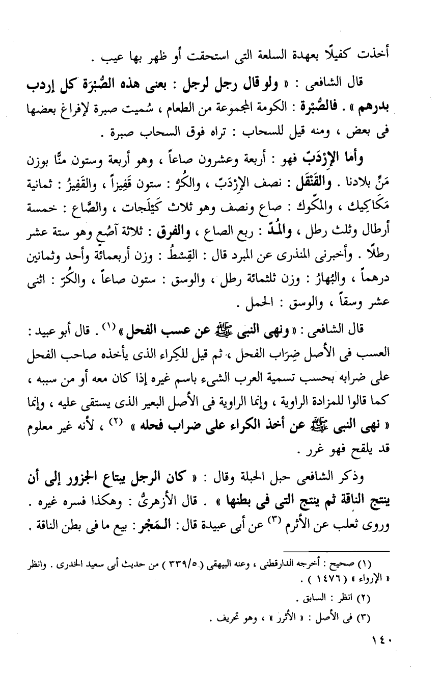 وأما الإردب فهو أربعة وعشرون صاعا وهو أربعة وستون منا بوزن بلادنا والقنقل نصف الإردب والكر ستون قفيزا والقفيز ثمانية مكاكيك والمكوك صاع ونصف وهو ثلاث كيلجات والصاع خمسة أرطال وثلث رطل والمد ربع الصاع والفرق ثلاثة أصوع وهي ستة عشر رطلا وأخبرني المنذري عن المبرد قال القسط وزن أربعمائة وأحد وثمانين درهما والبهار وزن ثلاثمائة رطل والوسق ستون صاعا والكر: إثنى عشر وسقا, والوسق: الحمل.