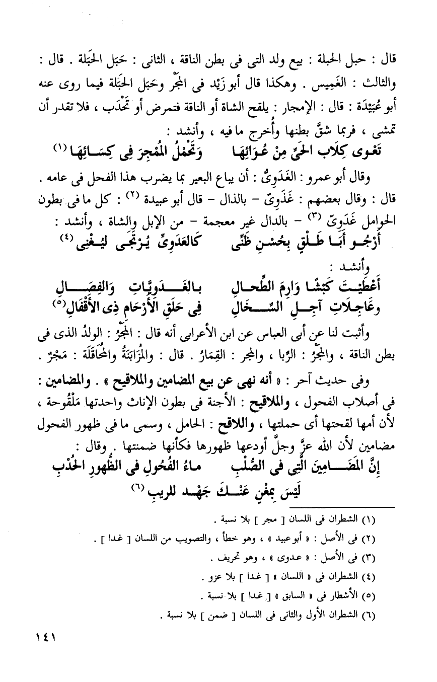 قال: وحبل الحبلة بيع ولد التي في بطن الناقة الثاني حبل الحبلة قال والثالث الغميس وهكذا قال أبو زيد في المجر وحبل الحبله فيما روى أبو عبيده قال الامجار أن تلقح الشاه أو الناقه فتمرض أو تجرب فلا تقدر أن تمشي فربما شق بطنها واخرج ما فيه وانشد: