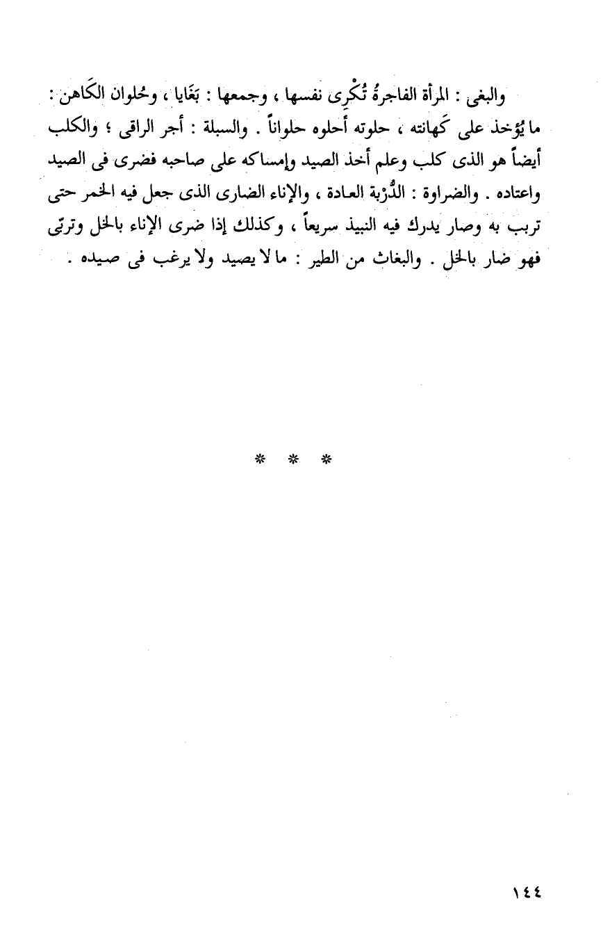 والبغى المرأة الفاجره تكرى نفسها وجمعها بغايا وحلوان الكاهن ما يأخذه على كهانته يقال حلوته احلوه حلوانا والبسله اجر الراقى والكلب الضارى هو الكلب الذي كلب وعلم اخذ الصيد وامساكه على صاحبه فضرى في الصيد واعتاده والضراوه العاده والدربه والاناء الضارى هو الذي جعل فيه الخمر حتى تربت به وصار يدرك فيه النبيذ سريعا وكذلك إذا ضرى الاناء بالخل وتربى به فهو ضار بالخل والبغاث من الطير ما لا يصيد ولا يرغب في صيده.
