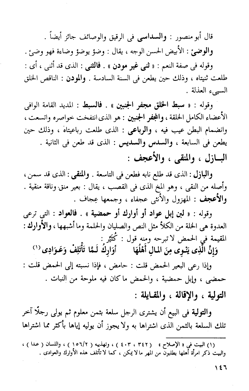 1- البيت في "الإصلاح" "342 , 403" وتهذيب "2 / 156" واللسان "عدا" والبيت ذكر امرأة أهلها يطلبون من المهر مالا يمكن , كما لا تأتلف هذه الأوارك والعوادي.