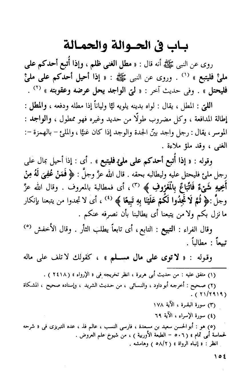وقوله: "اذا اتبع احدكم على مليء فليتبع" أي إذا احيل بماله على رجل آخر مليء فليحتل عليه وليطالبه بحقه قال الله عز وجل: {فَمَنْ عُفِيَ لَهُ مِنْ أَخِيهِ شَيْءٌ فَاتِّبَاعٌ بِالْمَعْرُوفِ} 3 أي فمطالة بالمعروف وقال الله عز وجل: {ثُمَّ لا تَجِدُوا لَكُمْ عَلَيْنَا بِهِ تَبِيعاً} 4 اي لا تجدوا من يتبعنا بانكار ما نزل بكم ولا من يتبعنا أي يطالبنا بأن نصرفه عنكم.