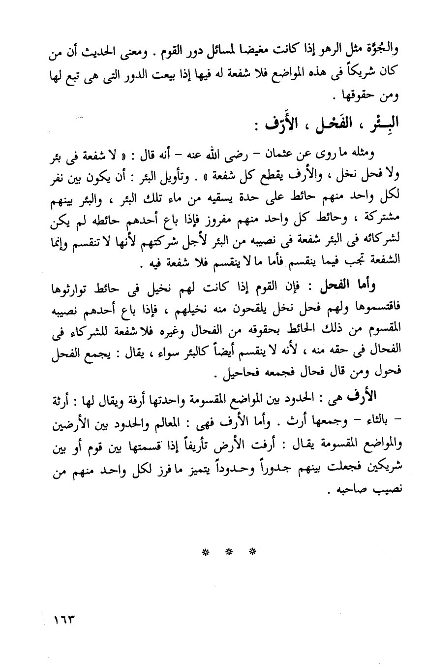 ومثله ما روى عن عثمان رضي الله عنه انه قال لا شفعه في بئر ولا فحل نخل والارف تقطع كل شفعه وتأويل البئر أن تكون بين نفر لكل واحد منهم حائط على حده يسقيه من ماء تلك البئر فالبئر بينهم مشتركه وحائط كل واحد منهم مفروز فإذا باع احدهم حائطه لم يكن لشركائه في البئر شفعه في نصيبه من البئر من اجل شركتهم لانها لا تنقسم وإنما الشفعه تجب فيما ينقسم فاما ما لا ينقسم فلا شفعة فيه.