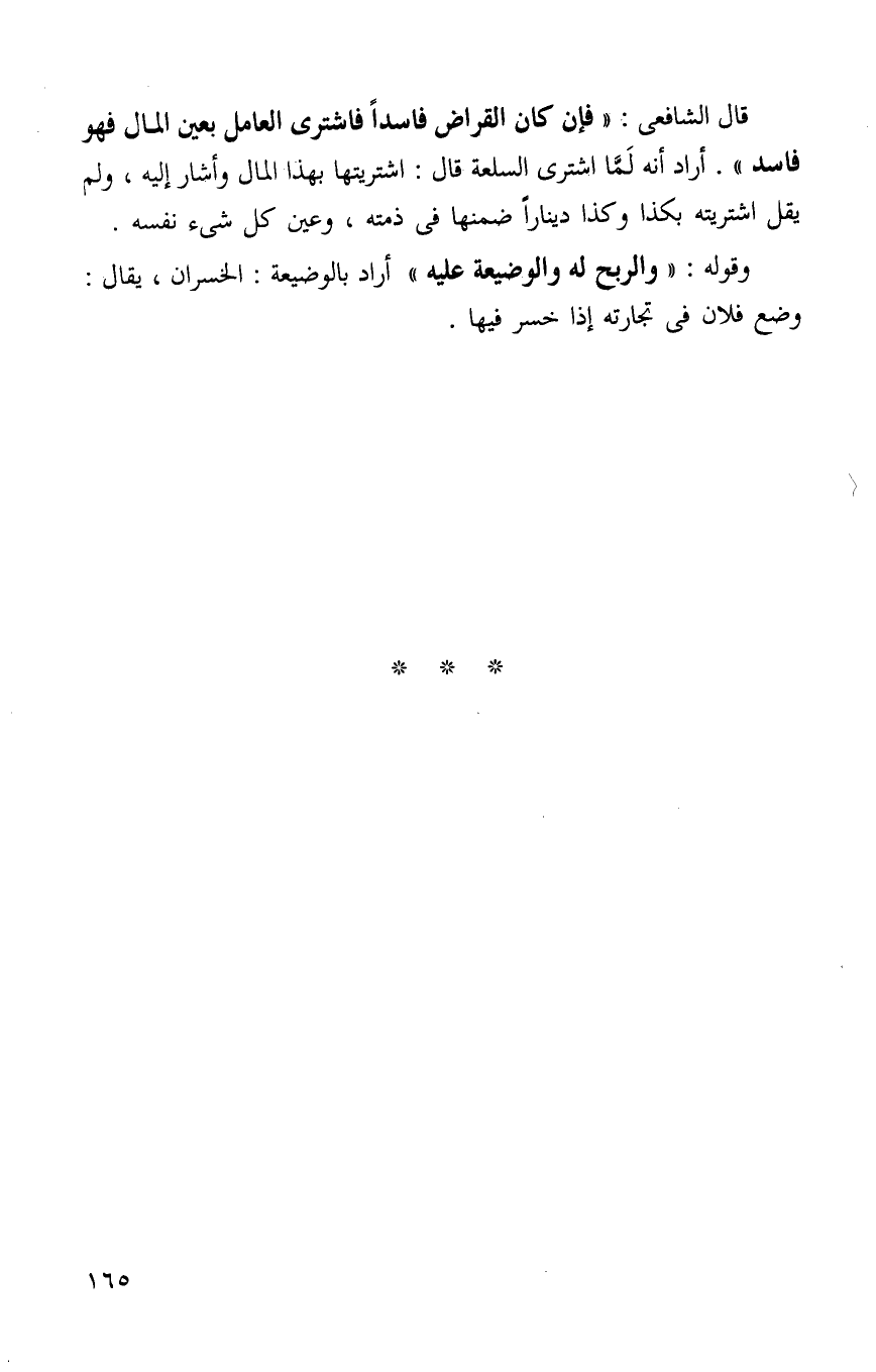 قال الشافعي: "فان كان القراض فاسدا فاشترى العامل بعين المال فهو فاسد" أراد انه لما اشترى السلعه قال اشتريتها بهذا المال واشار إليه ولم يقل اشتريته بكذا وكذا دينار ضمنها في ذمته وعين كل شيء نفسه.